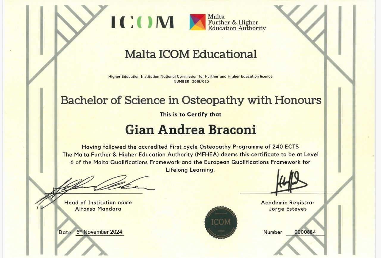 Mi chiamo Gian Andrea Braconi e sono un osteopata laureato presso l’International College of Osteopathic Medicine (ICOM) di Firenze, dove ho conseguito il titolo di BSc. Ost Hons.
