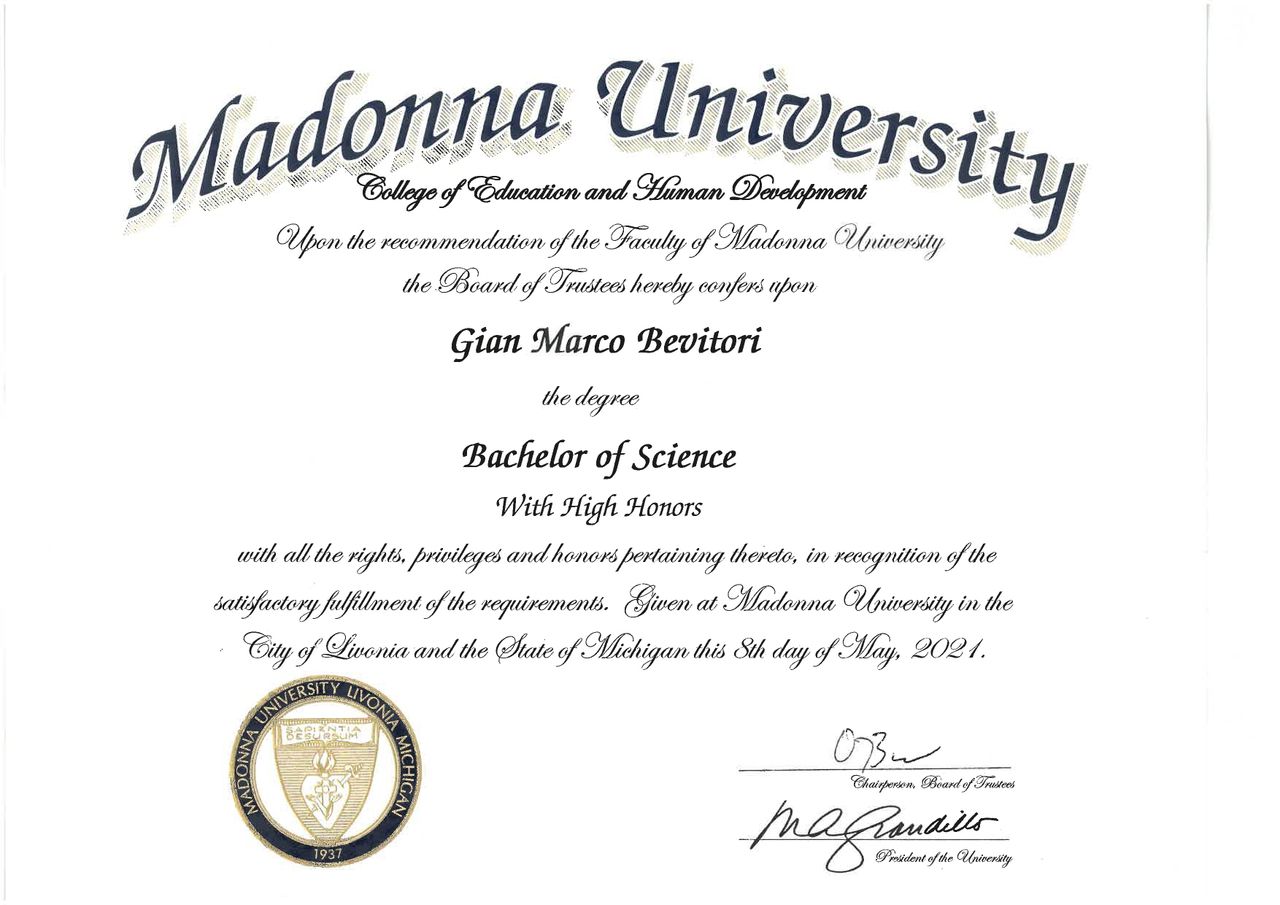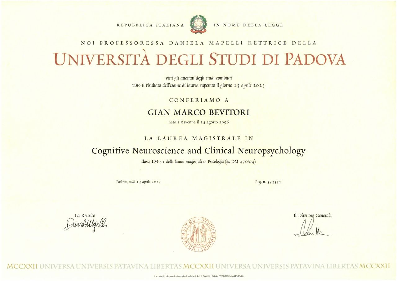 Nel 2021 ho conseguito la laurea in Psicologia negli Stati Uniti, e successivamente la Laurea Magistrale Specialistica in Psicologia LM-51 "Cognitive Neuroscience and Clinical Neuropsychology" presso L'Università degli Studi di Padova.