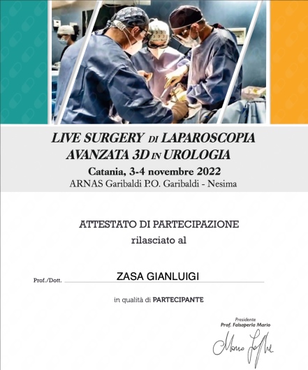 A novembre 2022 ha completato il corso live Surgery di Laparoscopia avanzata 3d in Urologia, presso l’ospedale Garibaldi-nesima di Catania, presidente del corso Prof. Mario Falsaperla.
