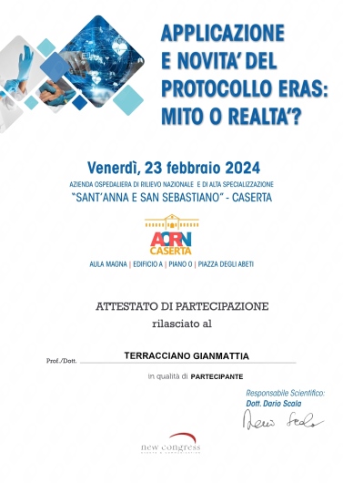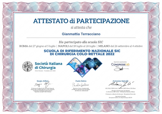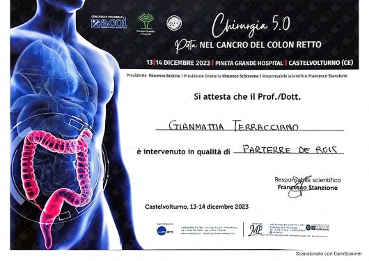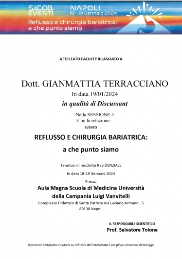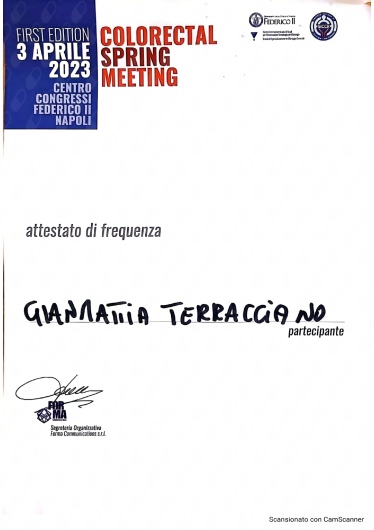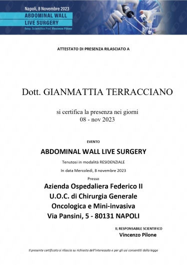 Sono il Dott. Gianmattia Terracciano, un medico chirurgo specialista in Chirurgia Generale. Laureato in medicina e chirurgia con il massimo dei voti nel 2015 presso la Seconda Università di Napoli, acquisisco la specializzazione in Chirurgia Generale con il massimo dei voti nel 2021 presso la medesima Università. Inizio, subito dopo la formazione specialistica, il mio percorso professionale presso l'Ospedale del Buon Consiglio Fatebenefratelli di Napoli come Dirigente Medico Chirurgo. Negli anni di formazione, dopo aver acquisito un solido training in chirurgia bariatrica, ho frequentato centri di eccellenza in chirurgia proctologica e in chirurgia oncologica colorettale, come l'IRCCS G. Pascale di Napoli, e partecipato a diversi corsi nazionali, maturando numerose esperienze chirurgiche. Ho partecipato a diverse pubblicazioni scientifiche come autore e coautore. Nel 2025 Ho acquisito un Master di II livello in "Colonproctologia e Patologie del pavimento pelvico" presso l'Università degli studi della Campania "Luigi Vanvitelli" con il massimo dei voti. La mia attività professionale è principalmente concentrata sulla Chirurgia Proctologica, Colorettale, Bariatrica e Generale. Effettuo tutte le procedure chirurgiche con approcci principalmente mininvasivi presso l'Ospedale del Buon Consiglio Fatebenefratelli di Napoli, la clinica Ruesch e la clinica Villa Angela.