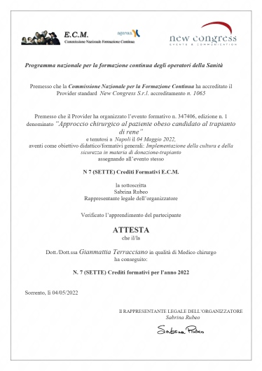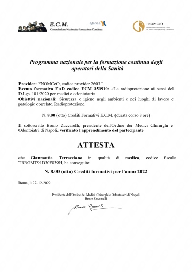 Il Dottor Gianmattia Terracciano è un Medico che svolge con impegno e dedizione la sua professione. Ha una buonissima preparazione ed esperienza curriculare e, senza alcuna presunzione, sono convinta che potrà diventare un luminare nel suo campo. Grazie mille per l'accortezza e professionalità