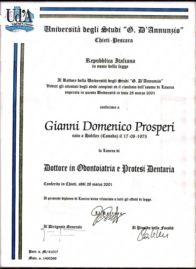 La passione del dott. PROSPERI per l’odontoiatria nasce all’età di 14 anni! Frequenta l’istituto superiore IPSIA di San Benedetto del Tronto, diplomandosi odontotecnico con il massimo dei voti (60/60) e ottenendo già in quegli anni il prestigioso riconoscimento Europeo (Expo dental student) per le migliori modellazioni dentali in cera! Nel 1996 vince il concorso di ammissione in Odontoiatria presso l’università “G.D’Annunzio” di Chieti ottenendo il primo posto assoluto nella graduatoria degli ammessi e nel 2001 si LAUREA in corso in ODONTOIATRIA E PROTESI DENTARIA con il massimo dei voti!