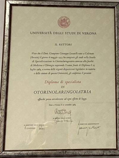 Ha ottenuto nel 1984 il Diploma di specialita' in Orl presso l'Universita' di Verona, con il massimo dei voti , presentando una tesi sperimentale riguardante una tecnica chirurgica per il trattamento dei linfonodi latero cervicali nei Carcinomi squamosi della testa e collo.