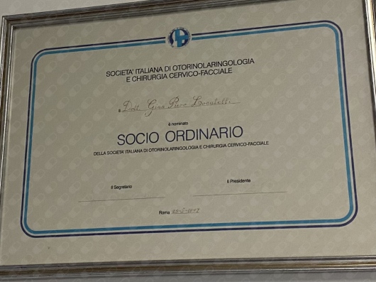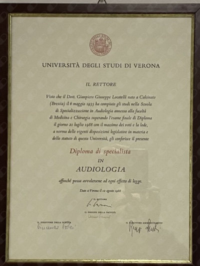 Ha ottenuto nel 1988 il secondo Diploma di specialita' in Audiologia presso l'Universita' di Verona , con il massimo dei voti , presentando una tesi sperimentale su una tecnica chirurgica per il trattamento dell'Otosclerosi