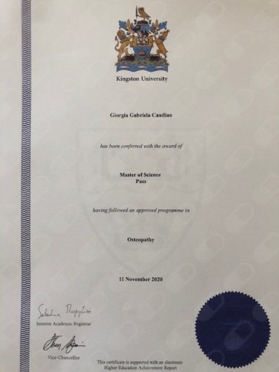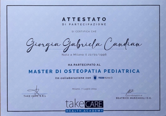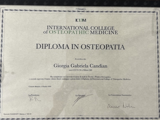 Dopo gli studi classici, nel 2015 intraprendo il percorso Full Time per il diploma osteopatico, presso la ICOM di Cinisello Balsamo. Nel 2020 concludo anche il Master of Science Osteopathy presso la Kingston Univerisity, sede Epsom (Regno Unito). Nel marzo 2023 acquisisco il patentino di Istruttore di ginnastica posturale, presso il CSEN. Nel luglio 2024 completo il Master di osteopatia pediatrica presso il TCIO Milano.