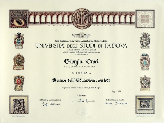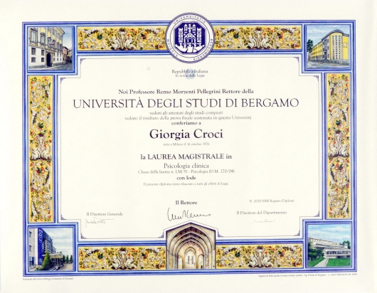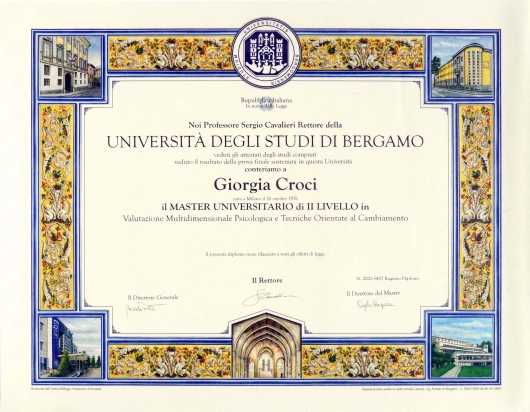 Per quanto riguarda la mia formazione professionale, durante il periodo di tirocinio post-lauream, nell'ambito della terapia analitica e in quella sistemico-famigliare, ho conseguito un Master Universitario, presso l'Università di Bergamo, nella valutazione psicologica, attraverso il colloquio e i test, e nella proposta di tecniche di intervento orientate al cambiamento.