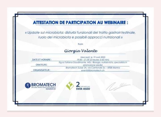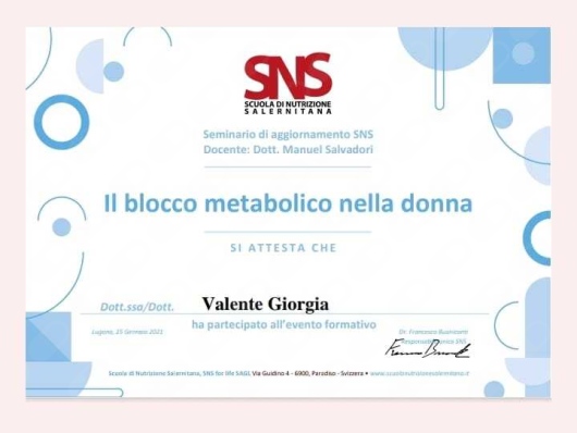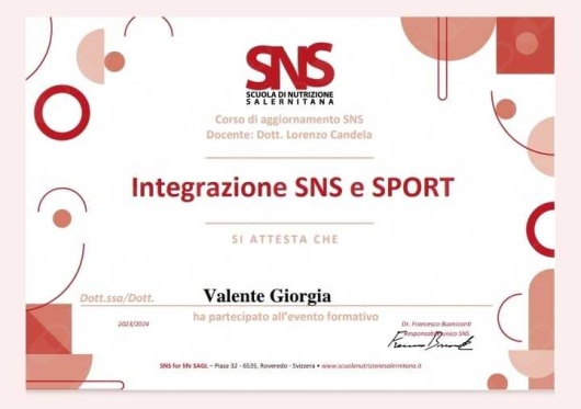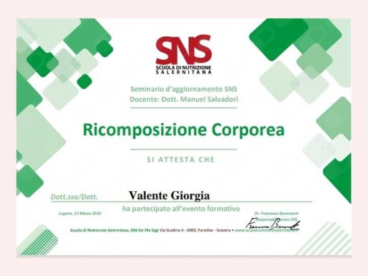Professionalità, attenzione, spiegazioni approfondite e dettagliate, disponibilità, nonché simpatia... Io mi trovo benissimo con la dottoressa Giorgia Valente, seguendo i suoi consigli e prescrizioni nutrizionali in pochi mesi ho raggiunto il mio scopo. Penso di poter dire "Ottimo"!