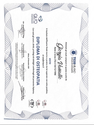 Dopo un percorso di cinque anni presso l’Istituto di Osteopatia TCIO di Milano, ho conseguito il titolo di Dottore in Osteopatia, approfondendo il rapporto tra sistema stomatognatico e terapia manuale osteopatica. Successivamente, ho completato un corso biennale in Massoterapia (MCB) – disciplina delle arti ausiliarie delle professioni sanitarie – presso la Kern School di Milano.