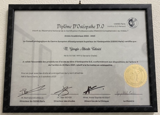 Sono un osteopata diplomato IEMO (durata quinquennale), con formazione internazionale presso la CEESO di Parigi. Ho approfondito lo studio dell’anatomia umana frequentando corsi di dissezione anatomica all’Università della Costa Azzurra di Nizza e proseguo costantemente la mia formazione con frequenti corsi post graduate. Tra questi, spiccano quelli con il dott. J.P. Meersseman, fondatore di Milan Lab e riferimento mondiale nella terapia manuale applicata allo sport e con Atle Thorstensen, uno dei maggiori esponenti europei delle tecniche di manipolazione strutturale avanzata.