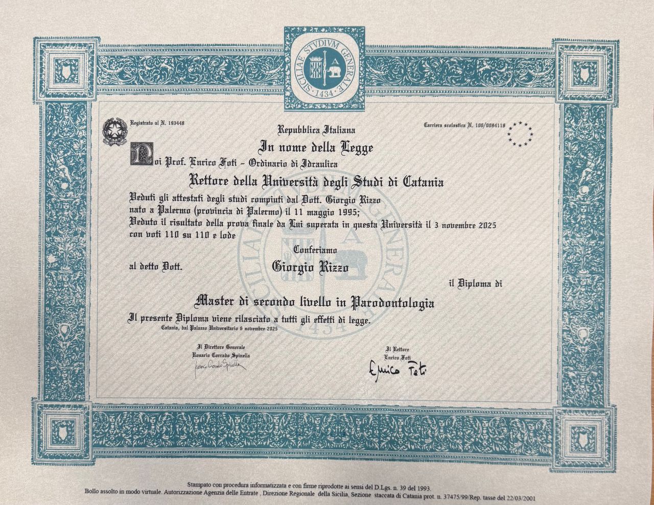Sono un professionista con formazione in odontoiatria e medicina estetica, orgogliosamente alla guida della terza generazione dello studio dentistico di famiglia, attivo dal 1955 nel cuore di Palermo in Via Terrasanta.