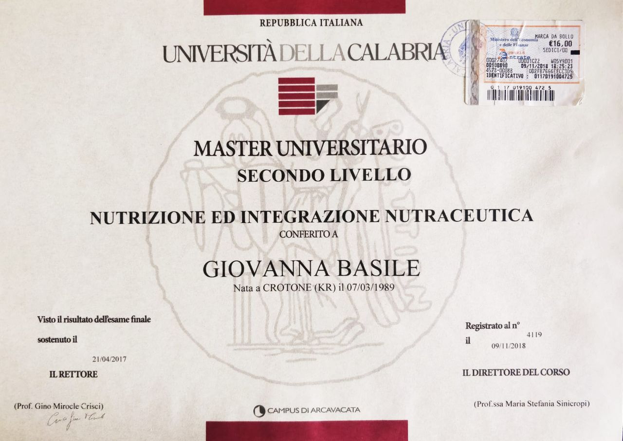 Nel 2017 conseguo un Master di II livello in Nutrizione e Integrazione Nutraceutica e nel 2019 vinco una Borsa di Studio conferita dall’Ordine Nazionale dei Biologi per la presentazione del progetto: “Approccio nutrizionale mirato all’allontanamento dei metalli pesanti in soggetti residenti nei siti di interesse nazionale (SIN) crotonesi”. Nello stesso anno ottengo un riconoscimento AIRC per lo stesso progetto.