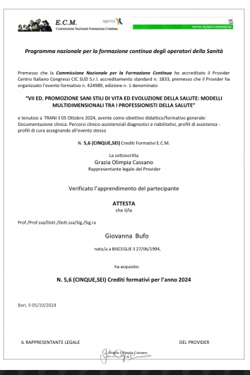 Parallelamente all’attività lavorativa, per arricchire il mio bagaglio culturale ho conseguito nel 2021 la laurea magistrale in Scienze degli Alimenti e Nutrizione Umana (LM-61), sempre presso l’Università di Foggia.