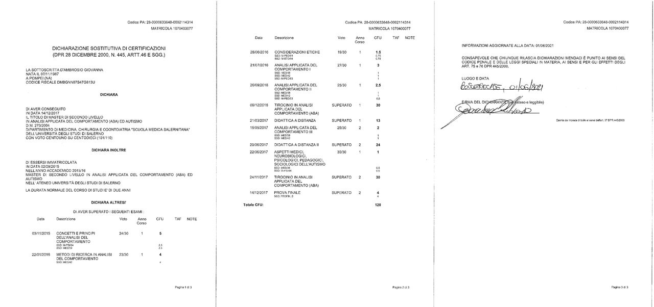 Ho conseguito la Laurea Magistrale in Psicologia Dinamica, Clinica e di Comunità, una specializzazione quadriennale in Psicoterapia ad Indirizzo Analitico Transazionale e un Master Universitario di II livello in Analisi Applicata del Comportamento (ABA) e Autismo.