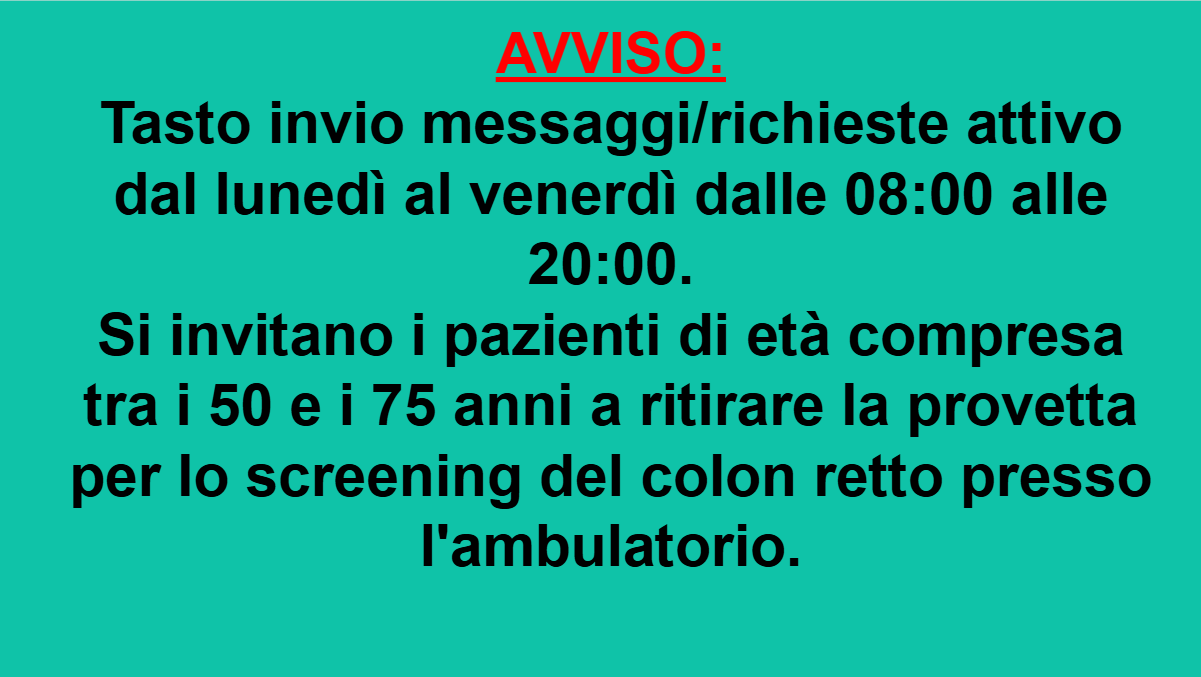 Si invitano i pazienti di età compresa tra i 50 e i 75 anni a ritirare la provetta per lo screening del colon retto presso l'ambulatorio.