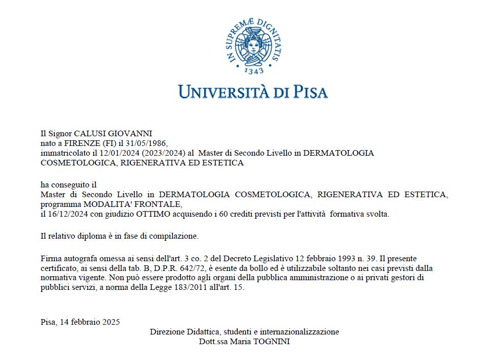 Ho deciso di sottopormi a un trattamento laser per il ringiovanimento della pelle del viso e non potrei essere più soddisfatta della mia scelta. Mi sono sentita accolta, ascoltata e rassicurata, grazie alla grande professionalità e sensibilità del dott. Calusi, che mi ha spiegato con chiarezza in cosa consistesse il trattamento, quali risultati aspettarmi e come sarebbe stato il percorso post-intervento. Questa attenzione al dettaglio e alla comunicazione mi ha fatto sentire in mani sicure e mi ha permesso di affrontare l’intervento con serenità.