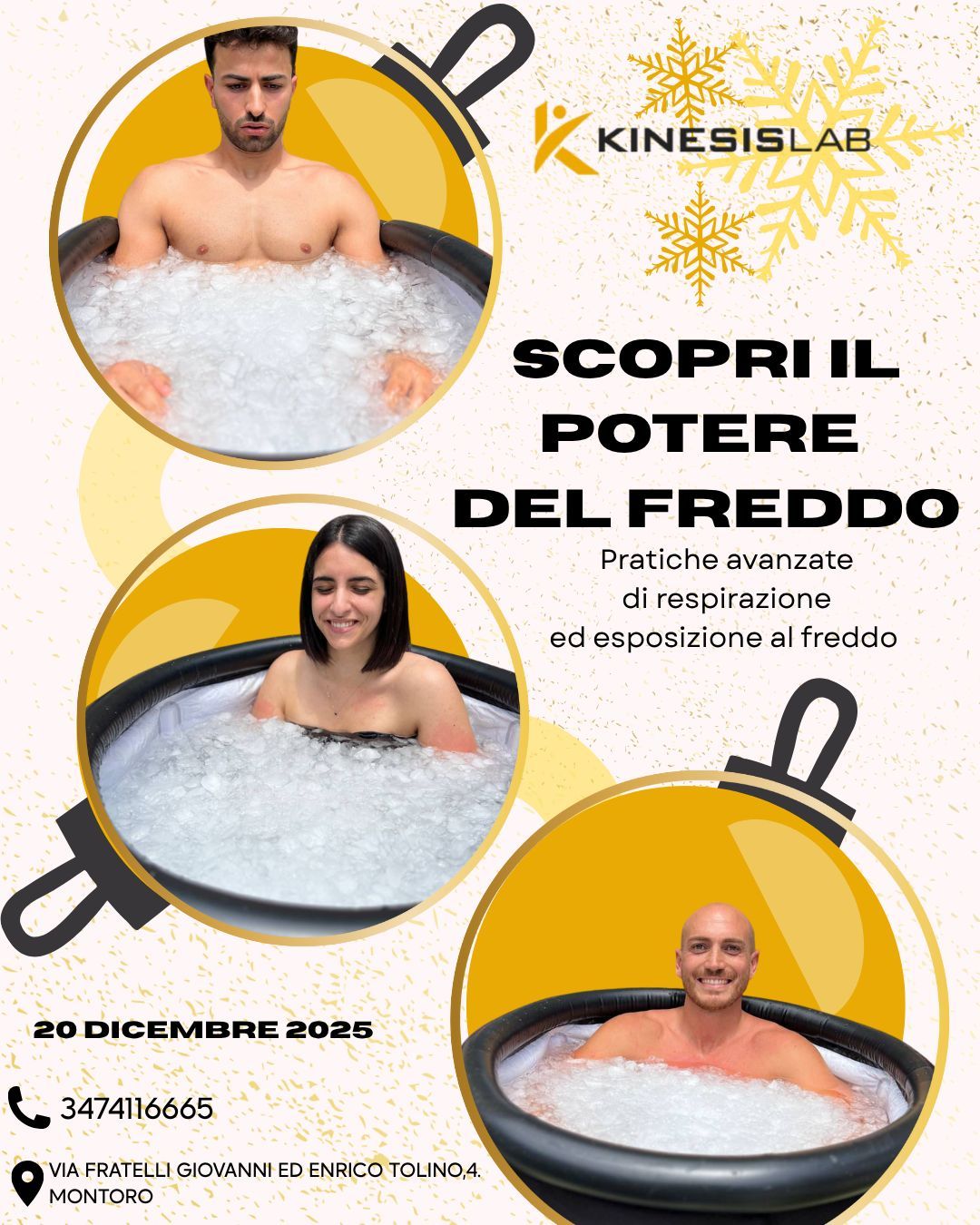 Sabato 20 dicembre crioterapia naturale con bagno ghiacciato in Kinesislab, il freddo intenso rappresenta una terapia straordinaria per ridurre infiammazione cronica e migliorare il benessere psicofisico. Montoro via frat.lli Giovanni ed Enrico Tolino 4.