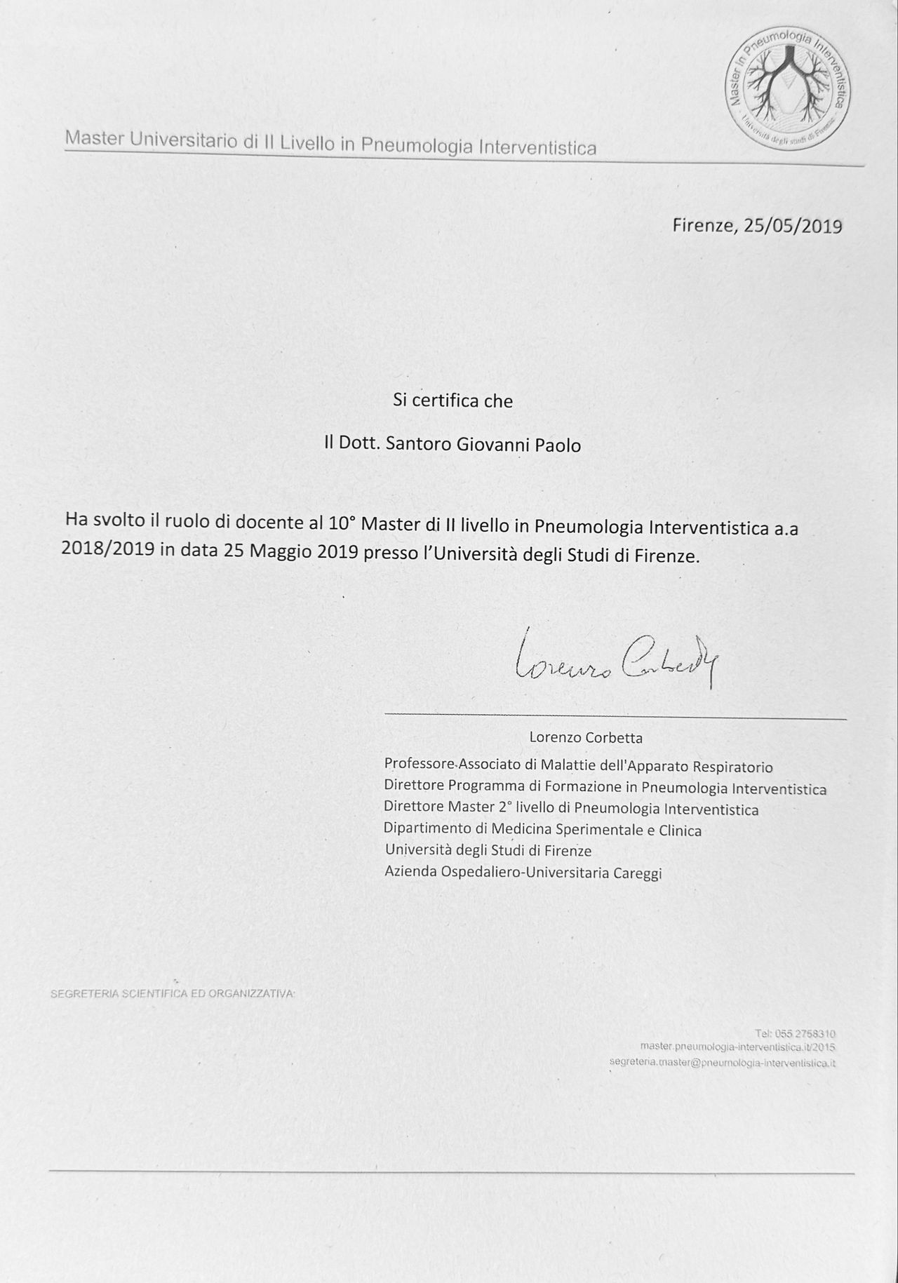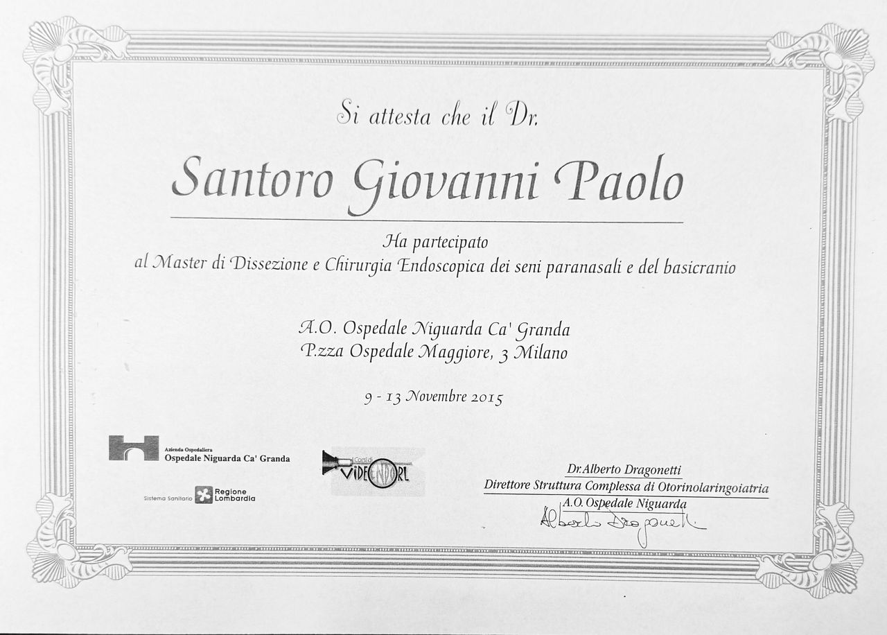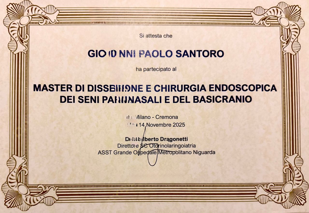Dal 2018 sono Medico Qualificato in Disturbi Respiratori Ostruttivi del Sonno e Russamento occupandomi della diagnosi (sleep endoscopy) e del trattamento chirurgico delle OSAS (Obstructive Sleep Apnea Syndrome).
