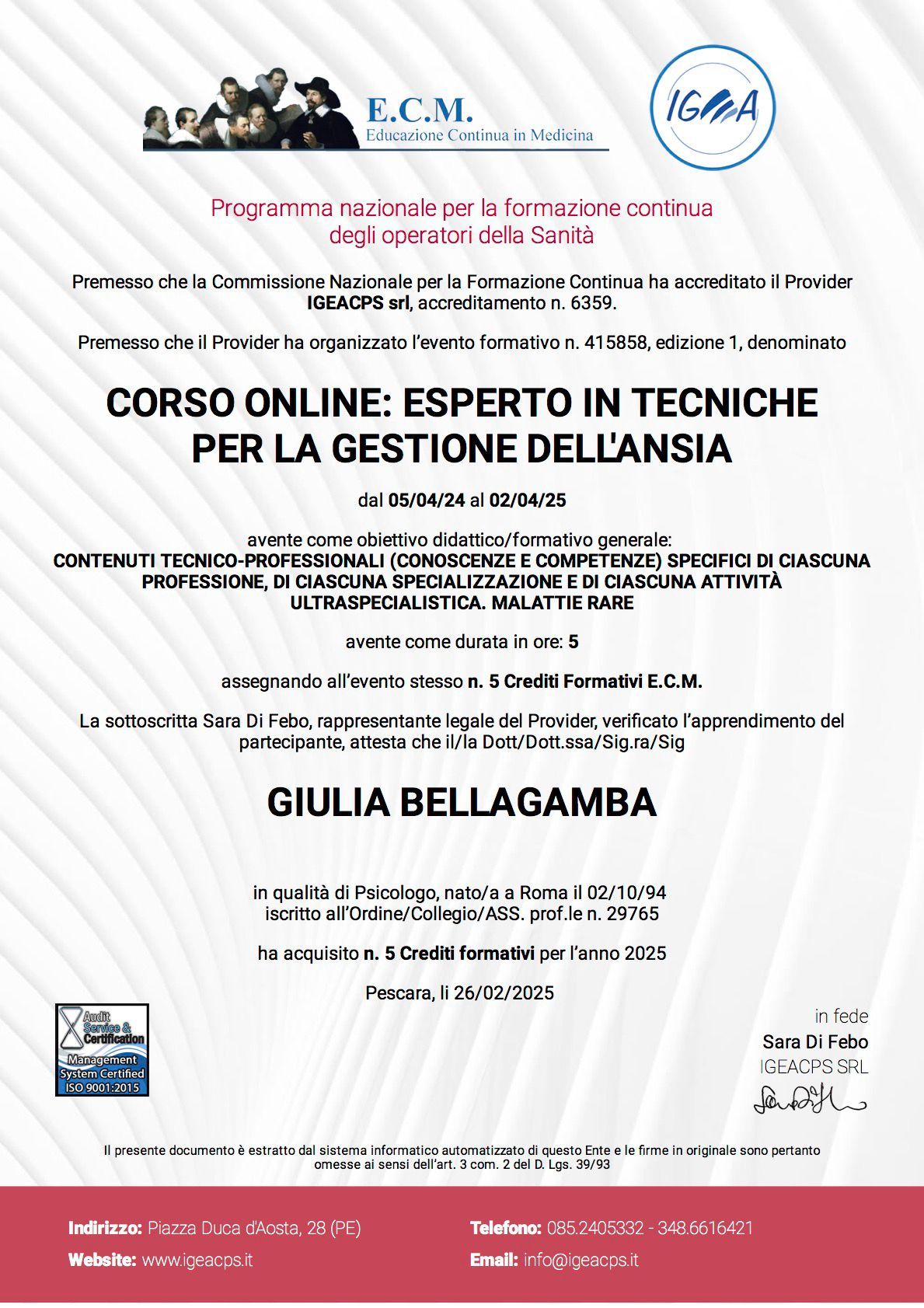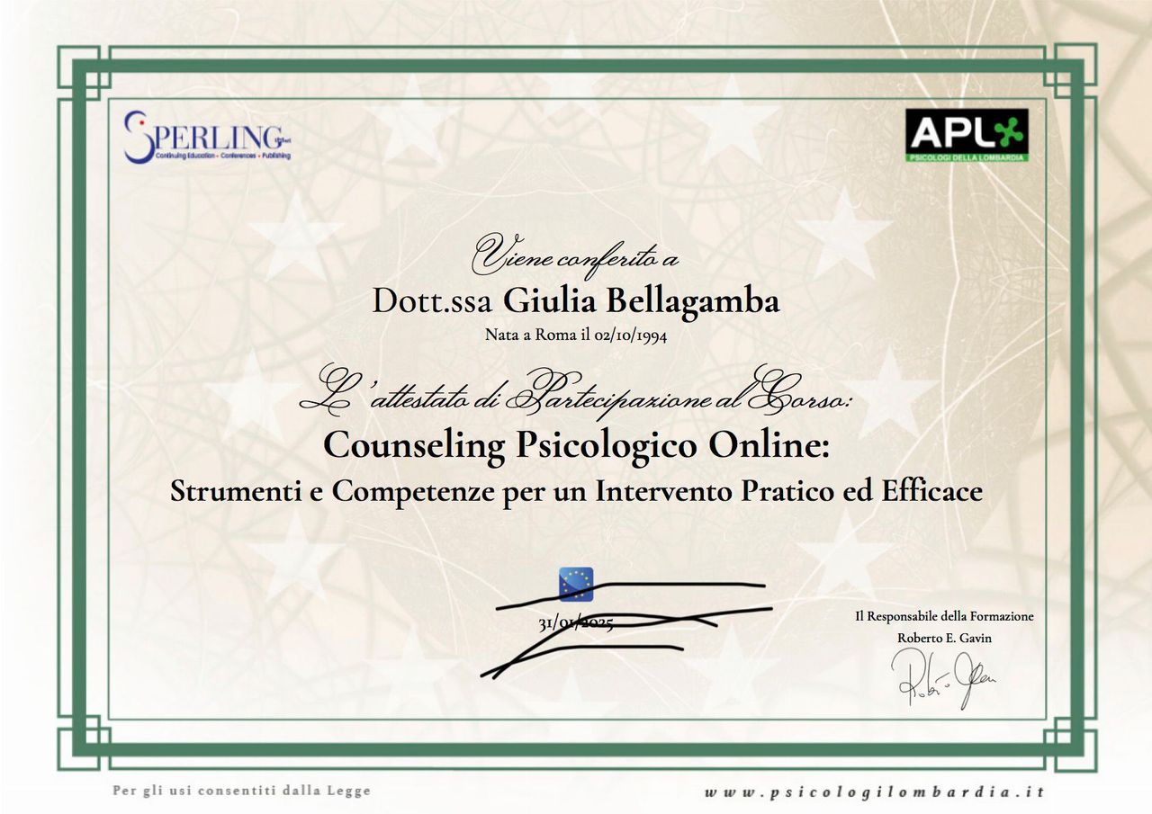 Mi chiamo Giulia Bellagamba e sono una Psicologa clinica iscritta alla sezione A dell'Albo degli Psicologi del Lazio con il n° 29765.
