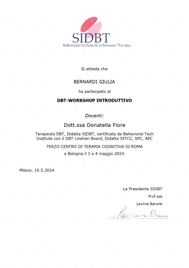 Mi sono rivolta alla dottoressa Bernardi in un momento di vita particolarmente difficile per me. Grazie a lei ora sto meglio e guardo al futuro con maggiore positività. Ho imparato a conoscere meglio me stessa e ciò che non mi fa stare bene, inoltre ora sento di avere maggiori risorse per gestire problemi e momenti difficili. Nella dottoressa Bernardi ho trovato gentilezza, competenza e professionalità.