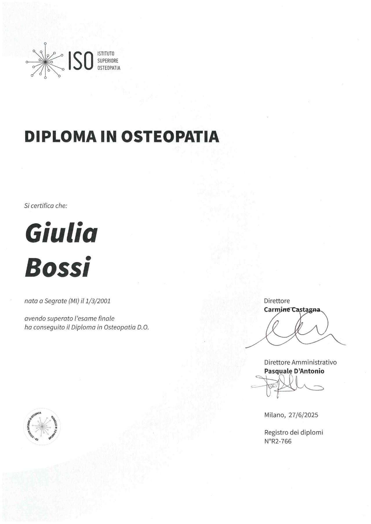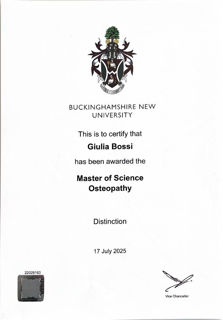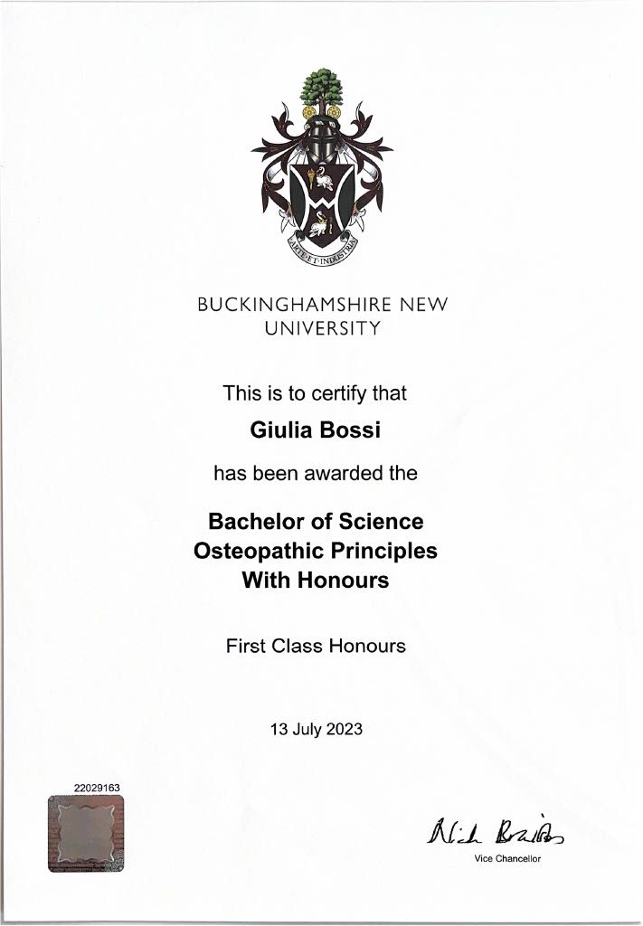 Grazie alla collaborazione tra ISO e la Buckinghamshire New University, ho ottenuto il Bachelor of Science in Osteopathic Principles (180 CFU) al terzo anno e il Master of Science in Osteopathy (120 CFU) al termine del quinto anno, per un totale di 300 CFU. Ho inoltre conseguito il Diploma in Osteopatia (D.O.), che consente l’iscrizione al Registro degli Osteopati d’Italia (ROI).