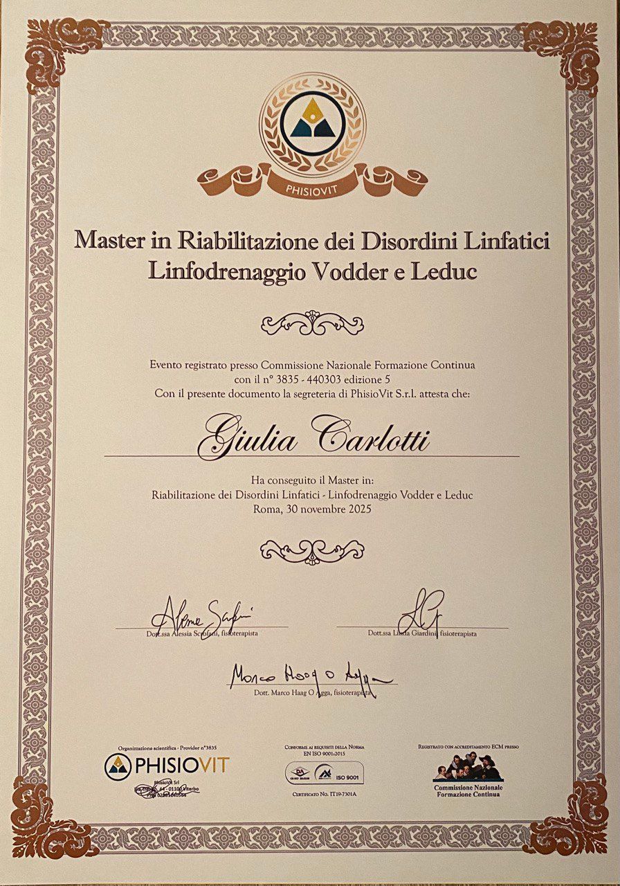 Ho completato la mia formazione con corsi di Idrokinesiterapia (Associazione ANIK) e Linfodrenaggio manuale secondo i metodi Vodder e Leduc, mantenendomi costantemente aggiornata per offrire un approccio sempre attuale e personalizzato ai miei pazienti.