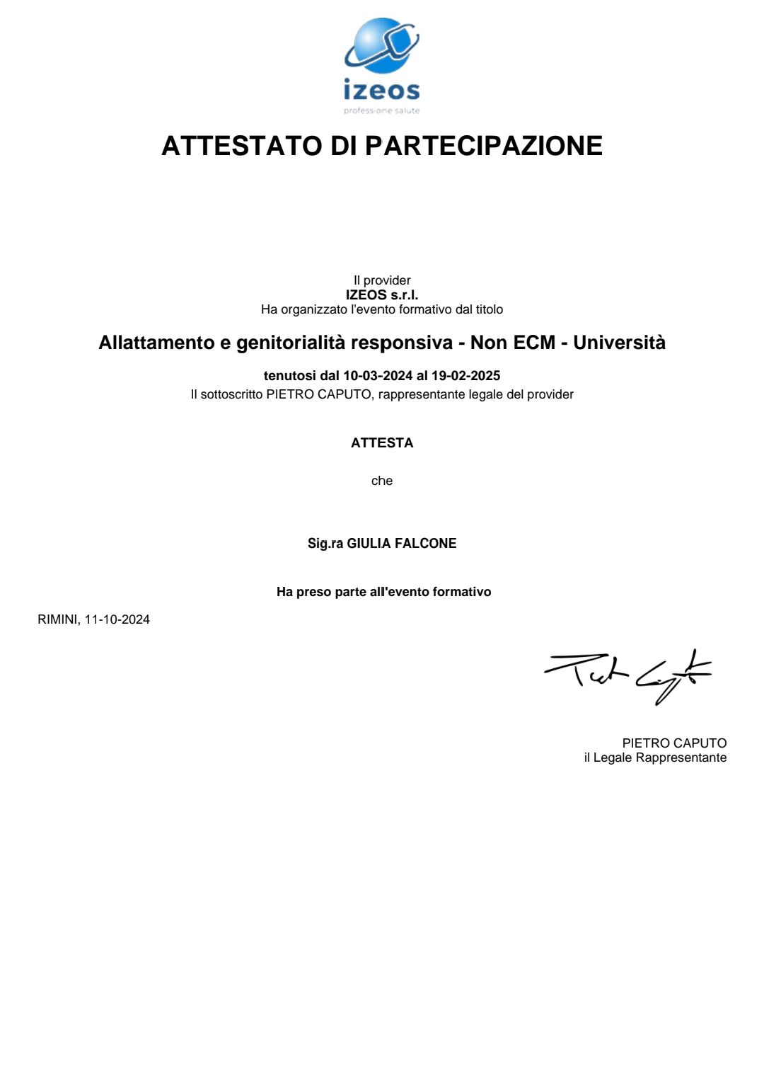 Ho avuto il piacere di essere seguita dalla dottoressa Giulia, nel percorso di autosvezzamento di mio figlio, il suo corso per me è stato fondamentale in questa fase importantissima di ogni bambino, e oltre al nostro incontro, Giulia è sempre disponibile quando si hanno delle domande o si è alla ricerca di consigli, lei c’è sempre, ti affianca costantemente in qualsiasi percorso si abbia iniziato.