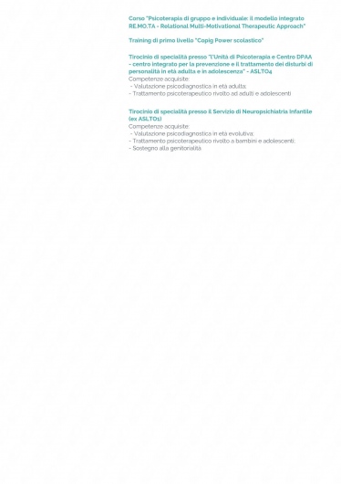Nel corso dei miei anni formativi ho collaborato con i servizi di psicologia evolutiva e con i centri di salute mentale del Servizio Sanitario Nazionale. In questi contesti, oltre ad acquisire esperienza come psicoterapeuta, ho affinato competenze psicodiagnostiche specifiche per l'età evolutiva (bambini e adolescenti) e per quella adulta attraverso il dialogo clinico e l'ausilio di test diagnostici.