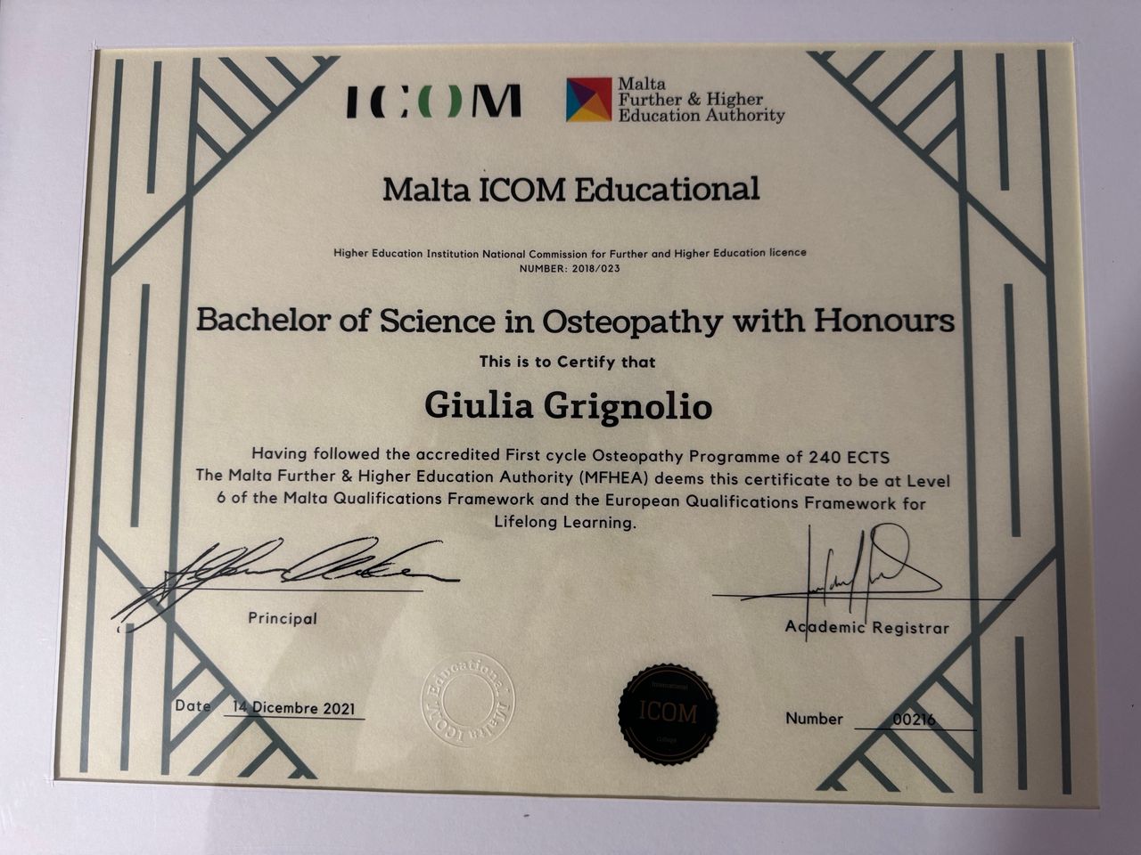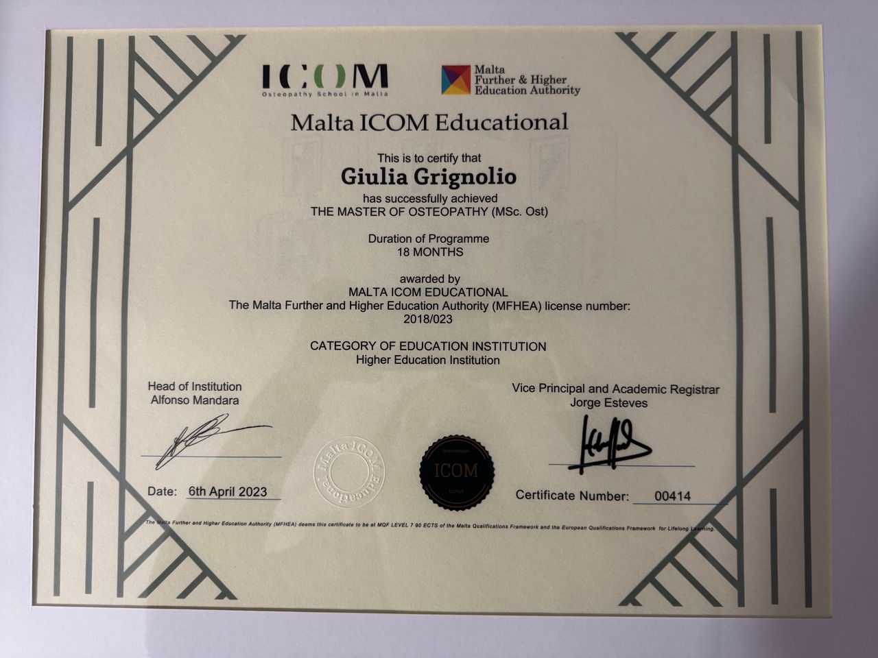 Sono un’osteopata laureata con BSc in Osteopatia e MSc (Master) in Osteopatia Pediatrica e Sportiva presso l’ICOM – International College of Osteopathic Medicine, completato dopo cinque anni di studio e pratica clinica avanzata.
