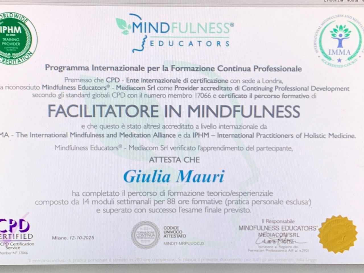 Sono inoltre formata come facilitatore Mindfulness; penso che sia fondamentale lasciare andare la modalità del fare ed entrare nella modalità dell'essere così da disinnescare il pilota automatico e vivere con maggior consapevolezza. La modalità dell'essere ci permette di sospendere il giudizio, quel giudizio che spesso alimenta la critica e, in primis, l'autocritica. Credo, quindi, che sia importante poter essere vigili a noi stessi, accogliendo le circostanze così come sono, fin da principio, in modo da interrompere la spirale dei pensieri negativi con i quali, a volte, ci identifichiamo e nei quali è possibile rimanere intrappolati. In questi termini, uno dei principi cardine su cui, in alcuni casi, mi preme lavorare nei percorsi di psicoterapia è l' accettazione dei momenti di difficoltà e delle emozioni a essi correlate; così da sostituire la comprensione alla rassegnazione per poter evolvere verso una nuova rinascita.
