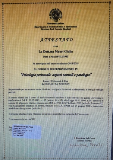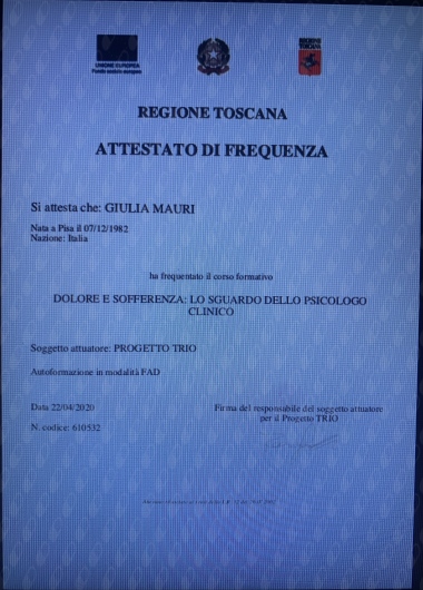 Sono la Dott.ssa Giulia Mauri psicologa iscritta all'Ordine degli Psicologi della Toscana (n° 9025), psicoterapeuta specializzata in psicoterapia sistemico-relazionale e certificata come facilitatore Mindfulness. Mi sono perfezionata in Psicologia Perinatale e ho svolto per diversi anni attività di ricerca e sostegno psicologico alle donne ricoverate per gravidanze ad alto rischio; inoltre mi sono occupata di attività di sostegno psicologico alle donne e alle coppie in cerca di un figlio fornendo un supporto alla genitorialità. Svolgo la libera professione a Pisa e mi occupo di sostegno psicologico individuale, di coppia e familiare volto ad una miglior conoscenza di sé stessi e al superamento di stress e problematiche psicologiche intrapersonali/ interpersonali (affettive, relazionali..) che si verificano durante le varie fasi del ciclo vitale. Uno degli elementi centrali del percorso di psicoterapia, nella mia pratica clinica, è la ricerca e la valorizzazione delle risorse personali con un conseguente potenziamento delle stesse. Sono fermamente convinta che il processo di ri-narrazione sia utile per poter vedere con occhi nuovi e consapevoli, per potersi riscoprire e riuscire a superare momenti di "impasse" che spesso portano ad un blocco o comunque alla perdita del "timone". È importante ricordare, infatti, che cristallizzare un evento e viverlo come sentenza non permette di farne tesoro per una crescita personale e sociale. Ecco allora che darsi l’opportunità di diventare protagonisti delle nostre storie (senza “subirle”), attraverso la ri-narrazione, ci aiuta a valorizzarle ma anche a scegliere ciò che possiamo lasciare andare. Ritengo che la ri-narrazione sia centrale in un percorso psicologico volto alla ripresa del "timone" della propria vita e dell'evoluzione della stessa come una sorta di viaggio che ci aiuti a ritrovare gli strumenti per proseguire il proprio cammino. Tutto questo senza scordare il contesto di relazioni in cui ogni persona è inserita cioè, in pieno stile "sistemico-relazionale", pensando alla nostra storia come ad una storia nelle storie che merita una rilettura per trovare le risorse necessarie per ripartire.
