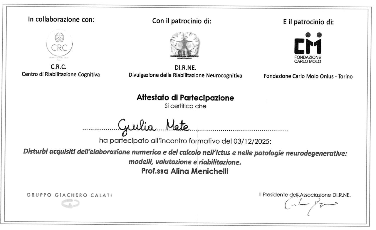 Svolgo anche attività di valutazione e riabilitazione neuropsicologica con pazienti adulti e anziani affetti da danno cerebrale acquisito e disturbi neurocognitivi. In particolare, mi occupo della valutazione delle funzioni cognitive e della progettazione e realizzazione di interventi di stimolazione e training neurocognitivi individuali rivolti a persone con esiti di ictus cerebrale, demenza, sclerosi multipla e patologie oncologiche cerebrali. Parte integrante del mio lavoro è il sostegno ai caregiver, fondamentale nel percorso di cura e adattamento alla malattia.