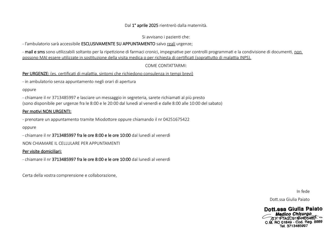 Per richiesta di farmaci cronici e impegnative di controllo paiato.giulia@gmail.com o SMS.