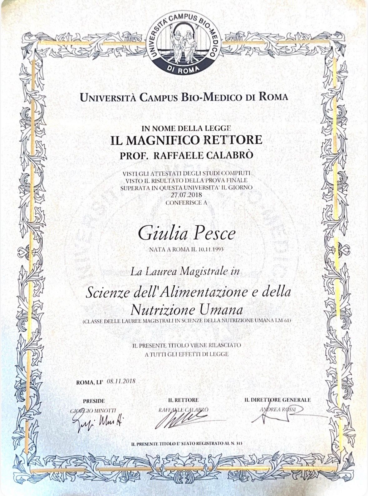 Mi sono laureata in Scienze dell’Alimentazione e della Nutrizione Umana presso l’Università Campus Bio-Medico di Roma, indirizzo Nutrizione Clinica, con votazione 110/110.