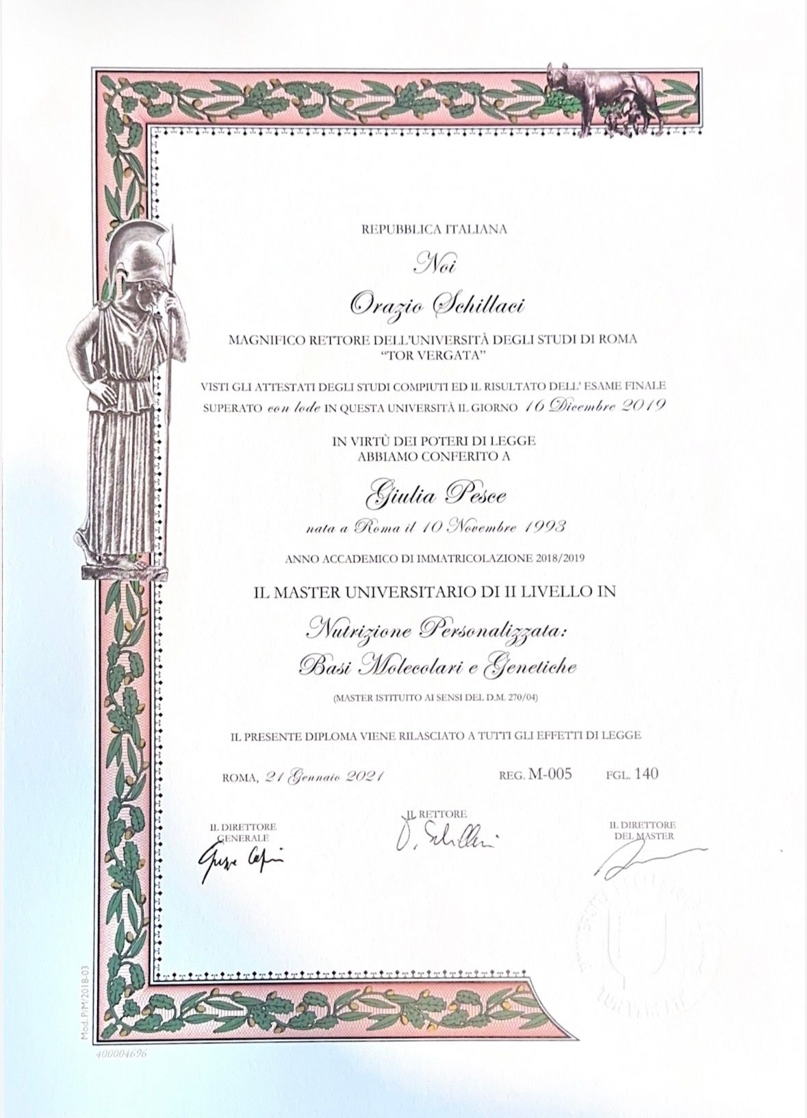 presso l’Università di Roma Tor Vergata in Nutrizione personalizzata: basi molecolari e genetiche (110/110 e lode), con tirocinio presso l’ambulatorio di Dietetica della Fondazione Santa Lucia e presso l’ambulatorio di Malattie Renali del Policlinico Tor Vergata;