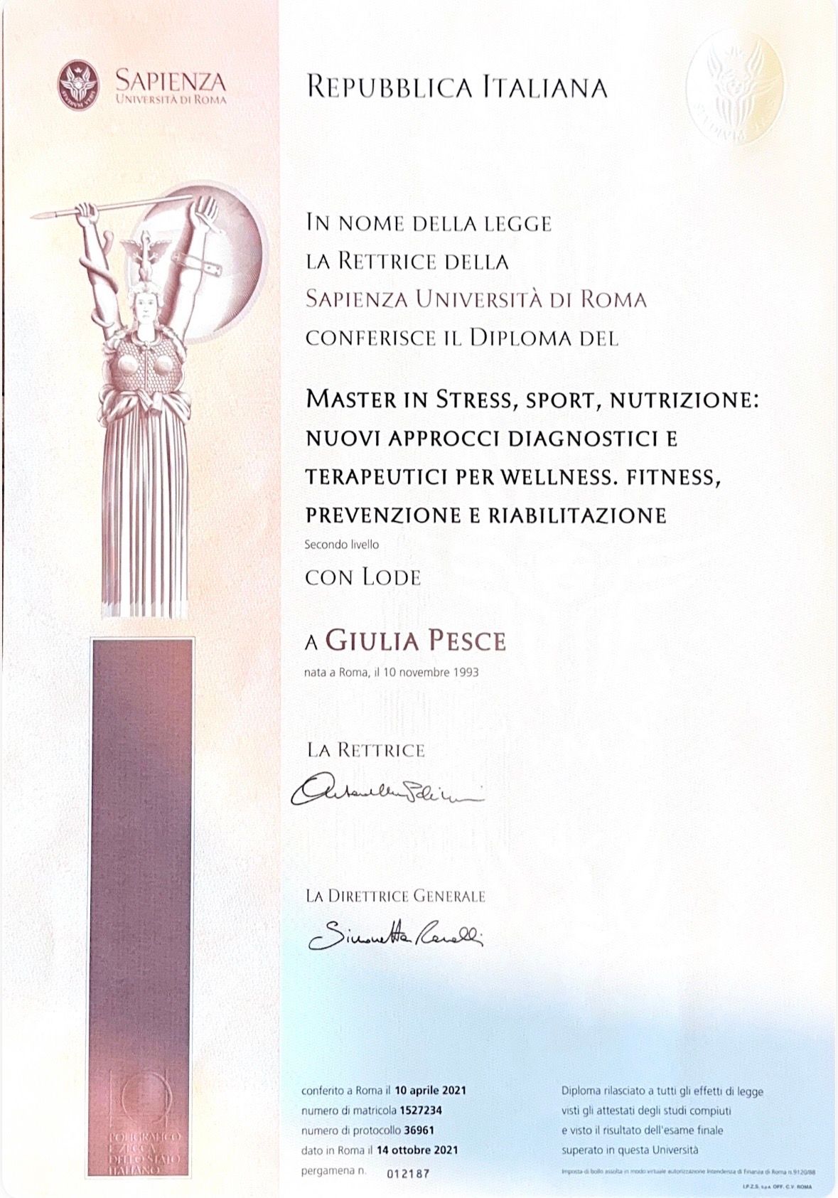 presso l’Università Sapienza di Roma in Stress, Sport e Nutrizione (110/110 e lode), che mi ha permesso di approfondire la relazione tra alimentazione, attività fisica e benessere psicofisico.