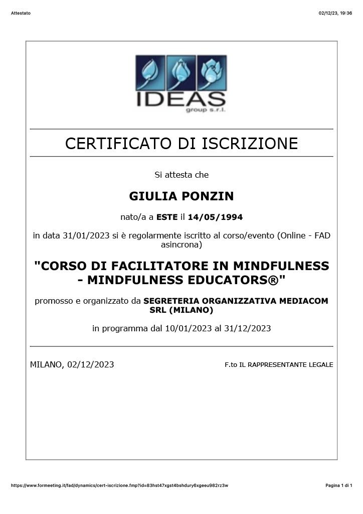 Ho conseguito la laurea triennale in Scienze Psicologiche dello Sviluppo e dell’Educazione presso l’Università di Padova e la laurea magistrale in Psicologia Scolastica e di Comunità presso l’Università di Bologna.