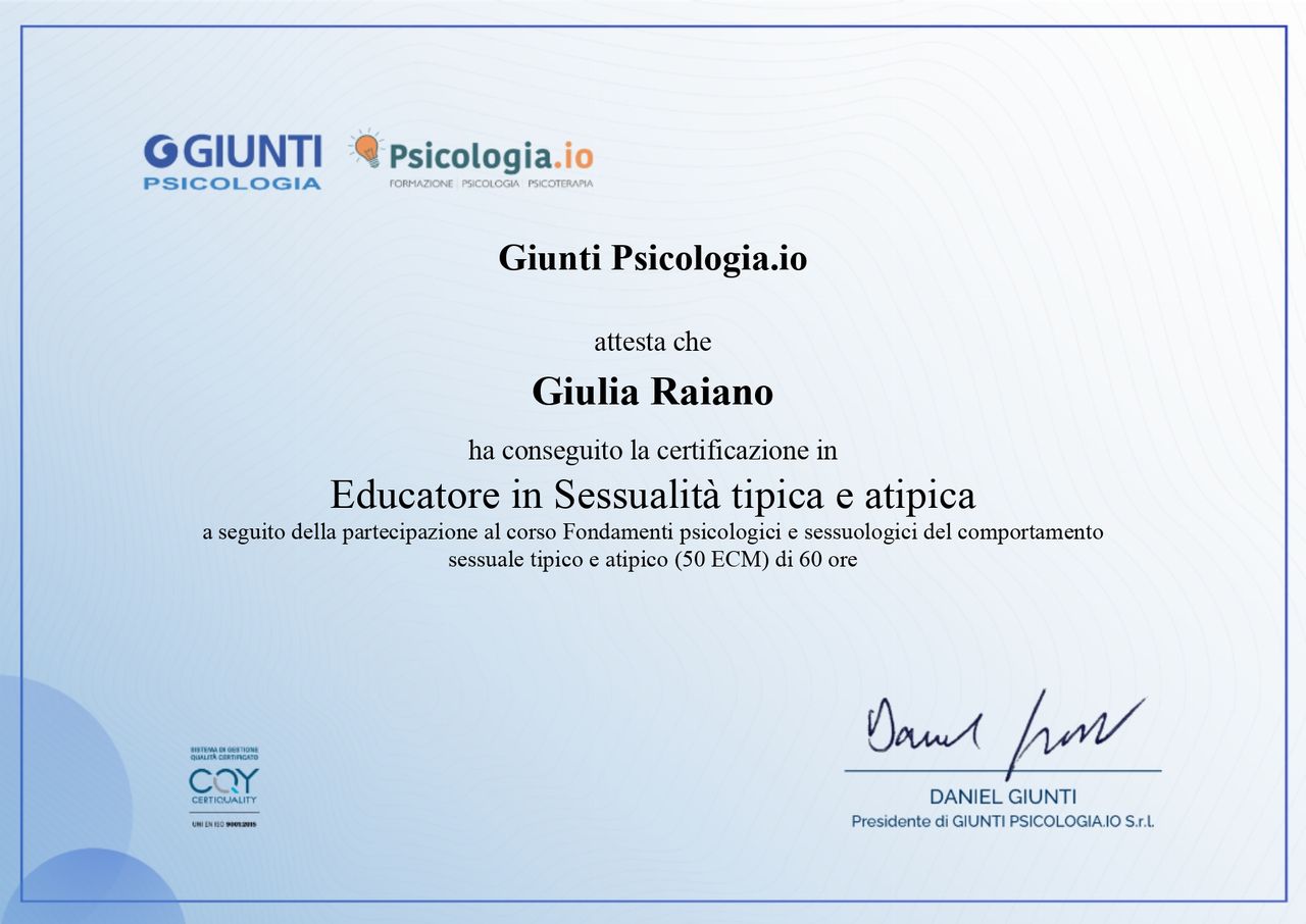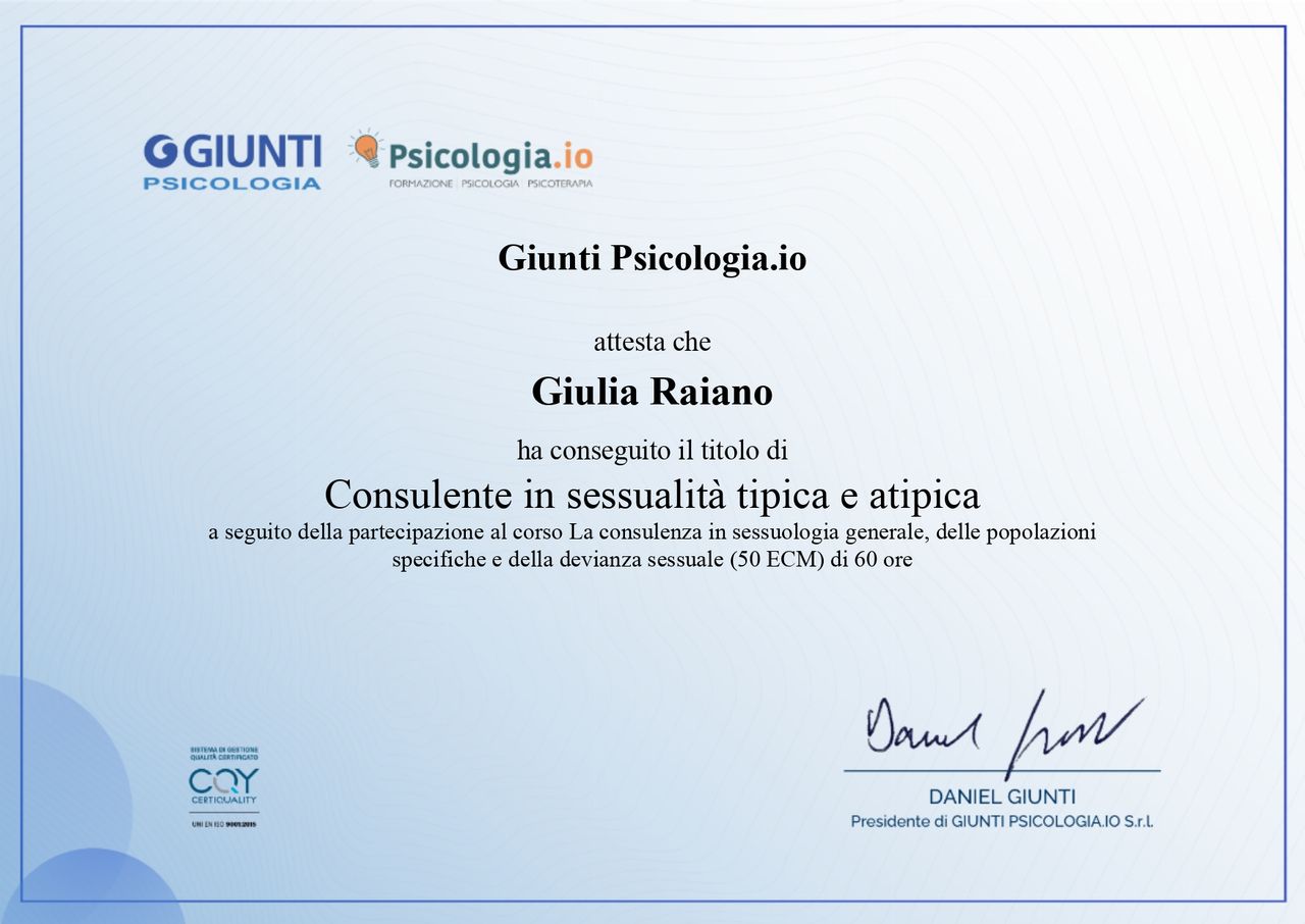 Mi sto specializzando anche come Sessuologa Clinica, per offrire un supporto ancora più mirato alle problematiche della sfera sessuale, affettiva e relazionale.