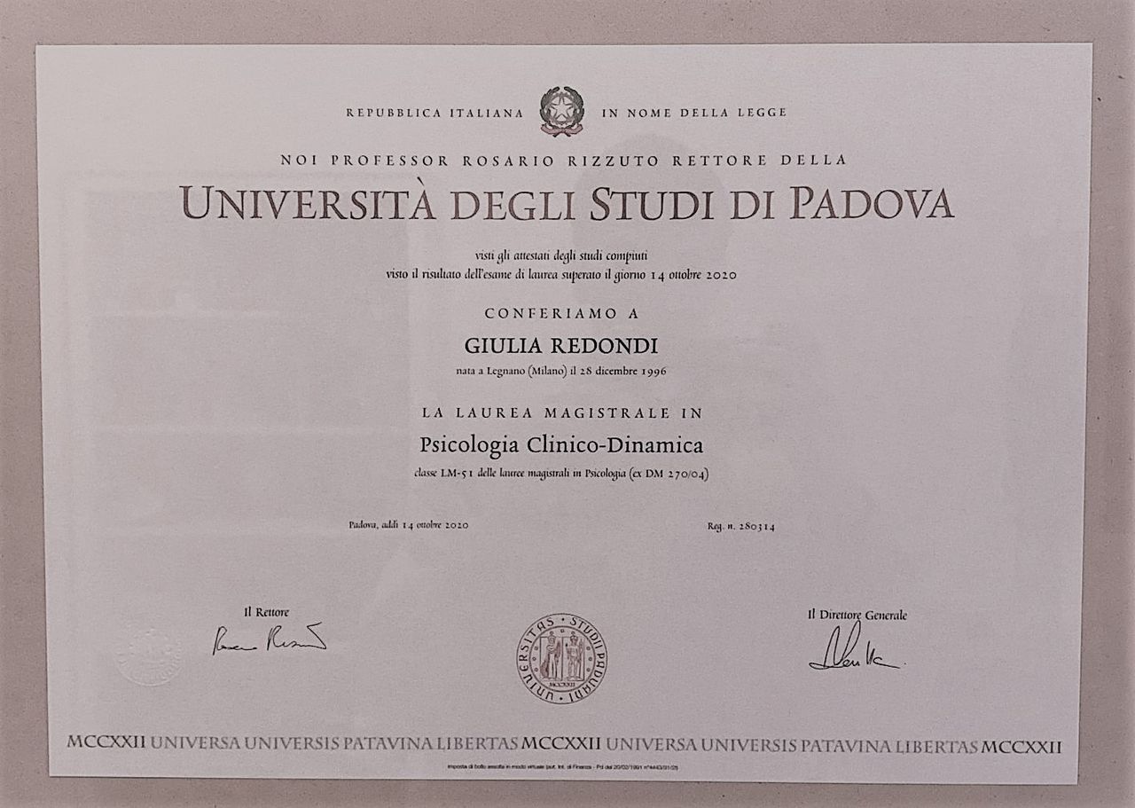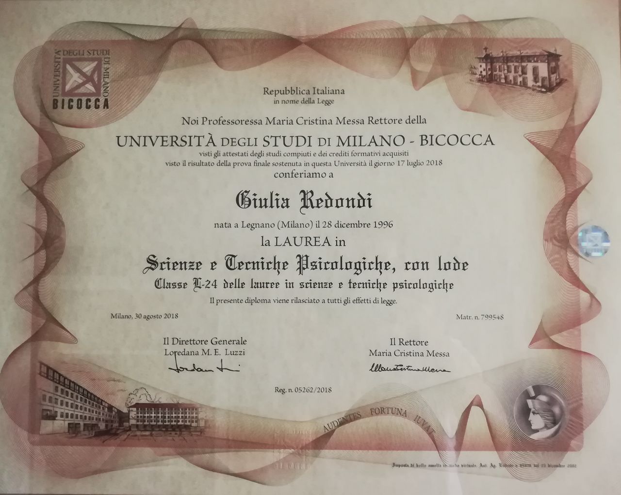 Sono la dott.ssa Giulia Redondi, psicologa clinica, laureata con Lode presso l'Università degli Studi di Padova. Dopo la laurea, ho intrapreso un percorso di specializzazione in Psicoterapia Analitico-Relazionale presso "IL RUOLO TERAPEUTICO" di Milano.