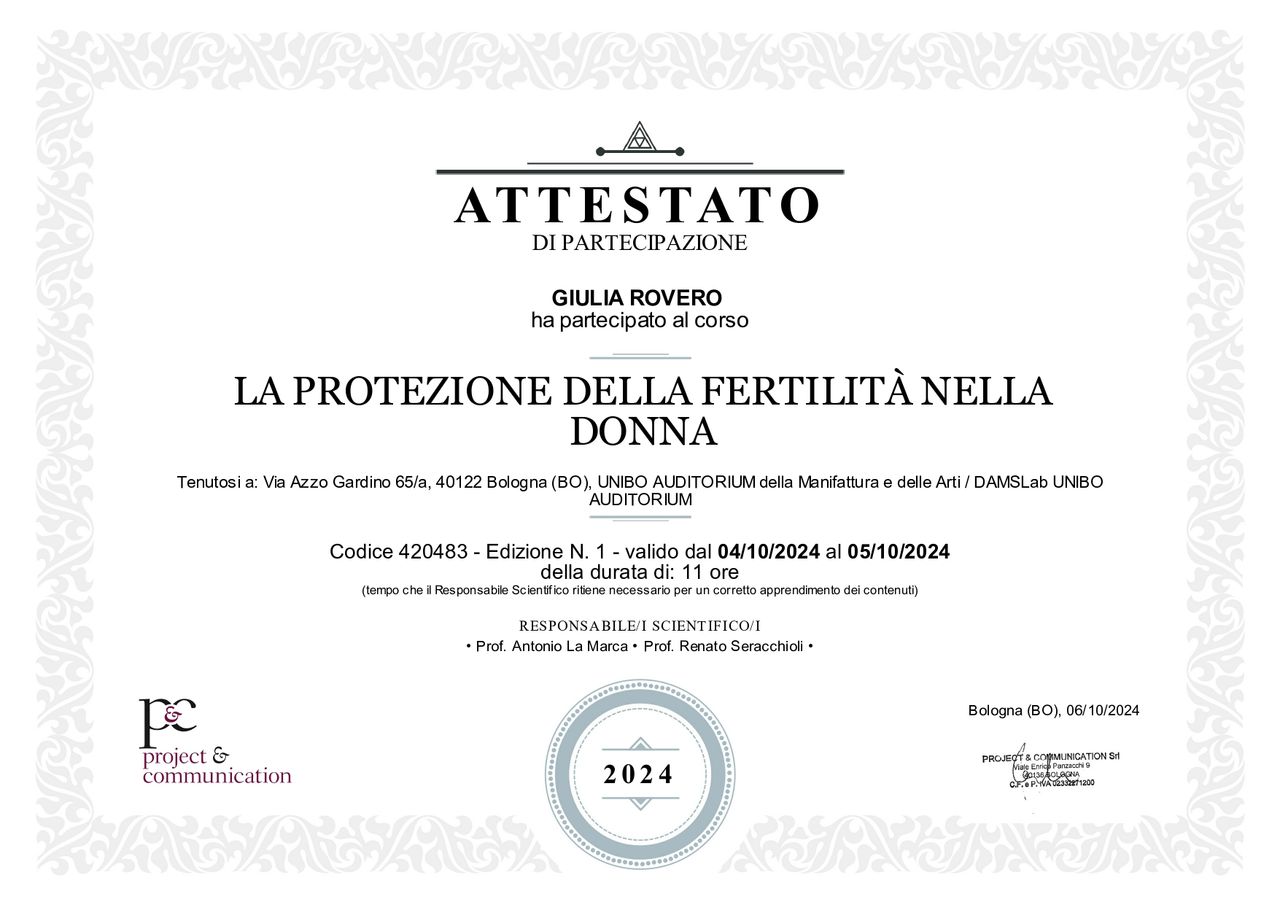 Nel 2023 ha conseguito la specializzazione in Ginecologia e Ostetricia presso l’Università degli Studi di Bologna con il Professor Renato Seracchioli, riportando la votazione di 110 su 110 e Lode.