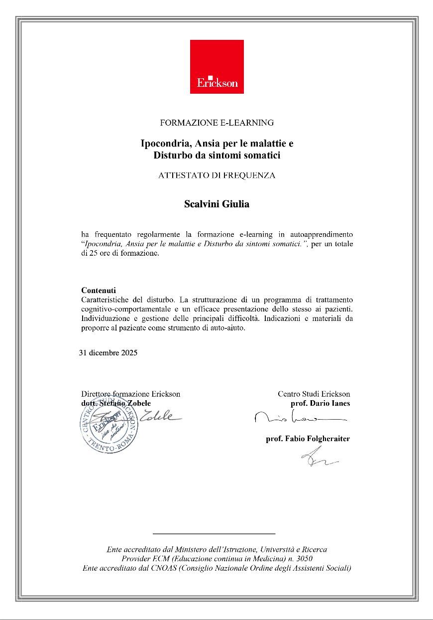 Ho avuto un'esperienza molto positiva con la Dott.ssa Scalvini. È una professionista molto attenta, e mi ha aiutato a superare un periodo difficile della mia vita. È stata molto disponibile a rispondere alle mie domande e a chiarire i miei dubbi. I tempi di attesa sono brevi e lo studio è facilmente accessibile. Consiglio vivamente la Dott.ssa Scalvini a chiunque stia cercando un aiuto psicologico.