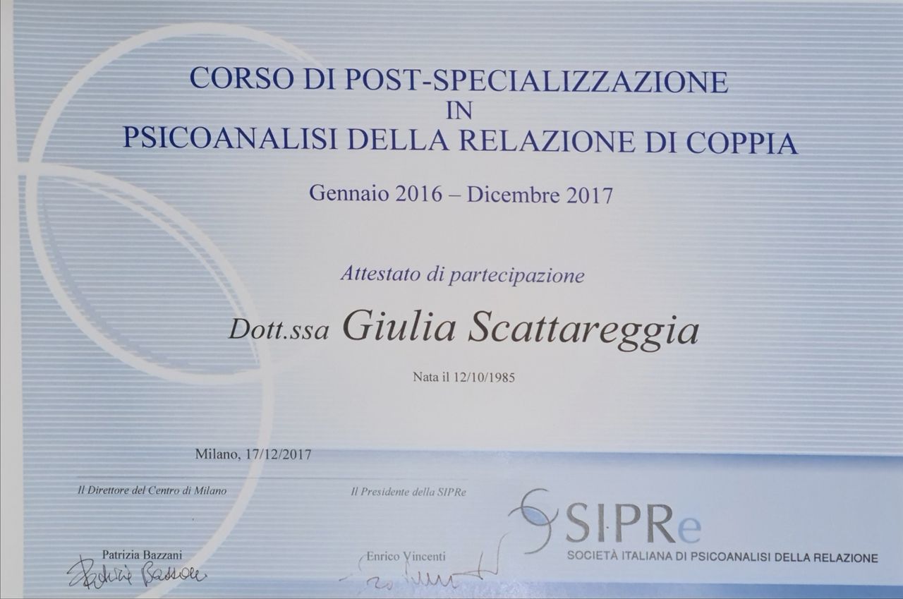 Mi sono poi specializzata in Psicoterapia ad orientamento Psicoanalisi della Relazione presso la Società Italiana di Psicoanalisi della Relazione (SIPRe di Milano).