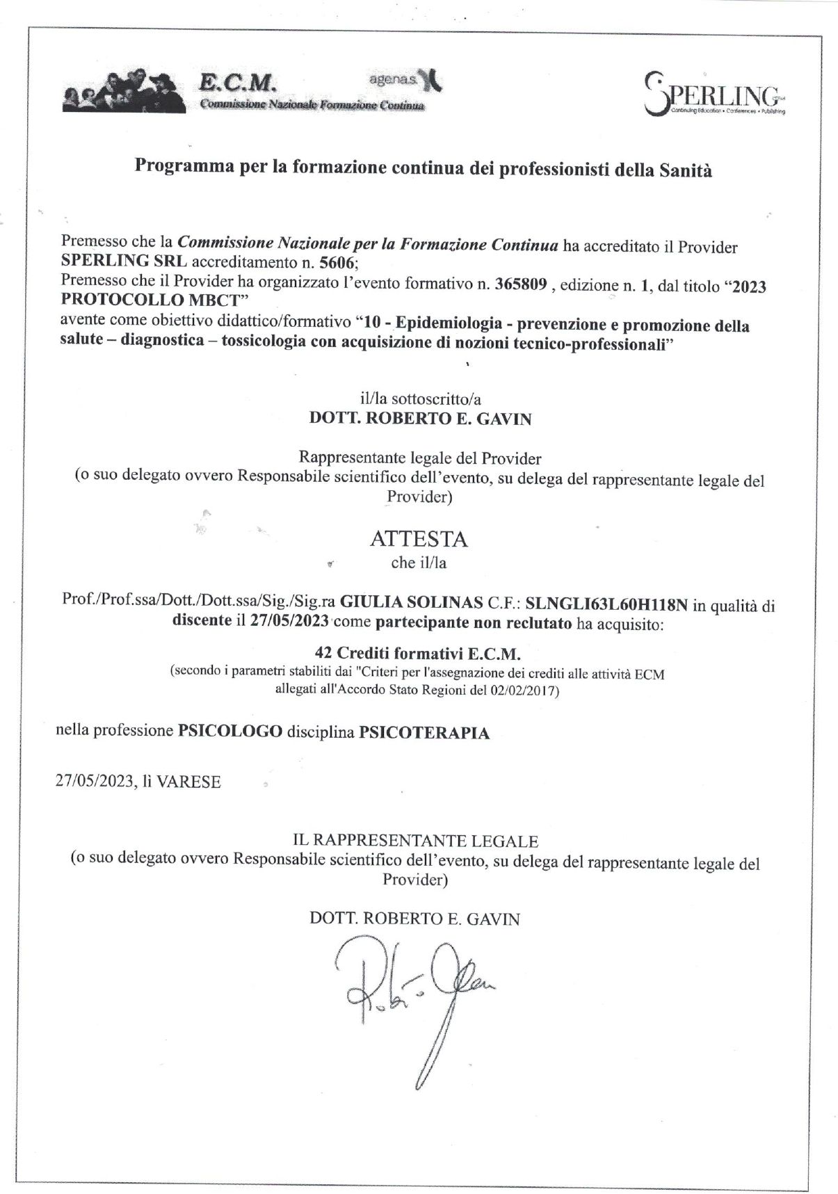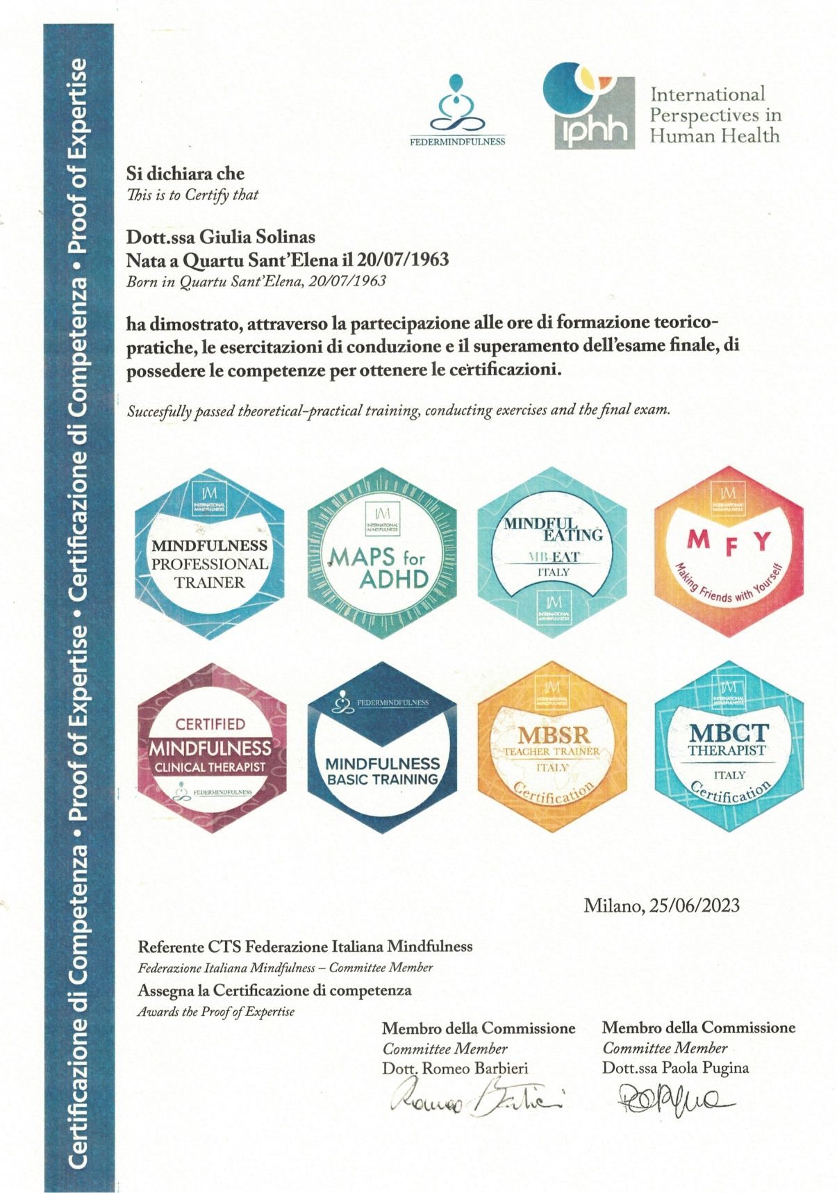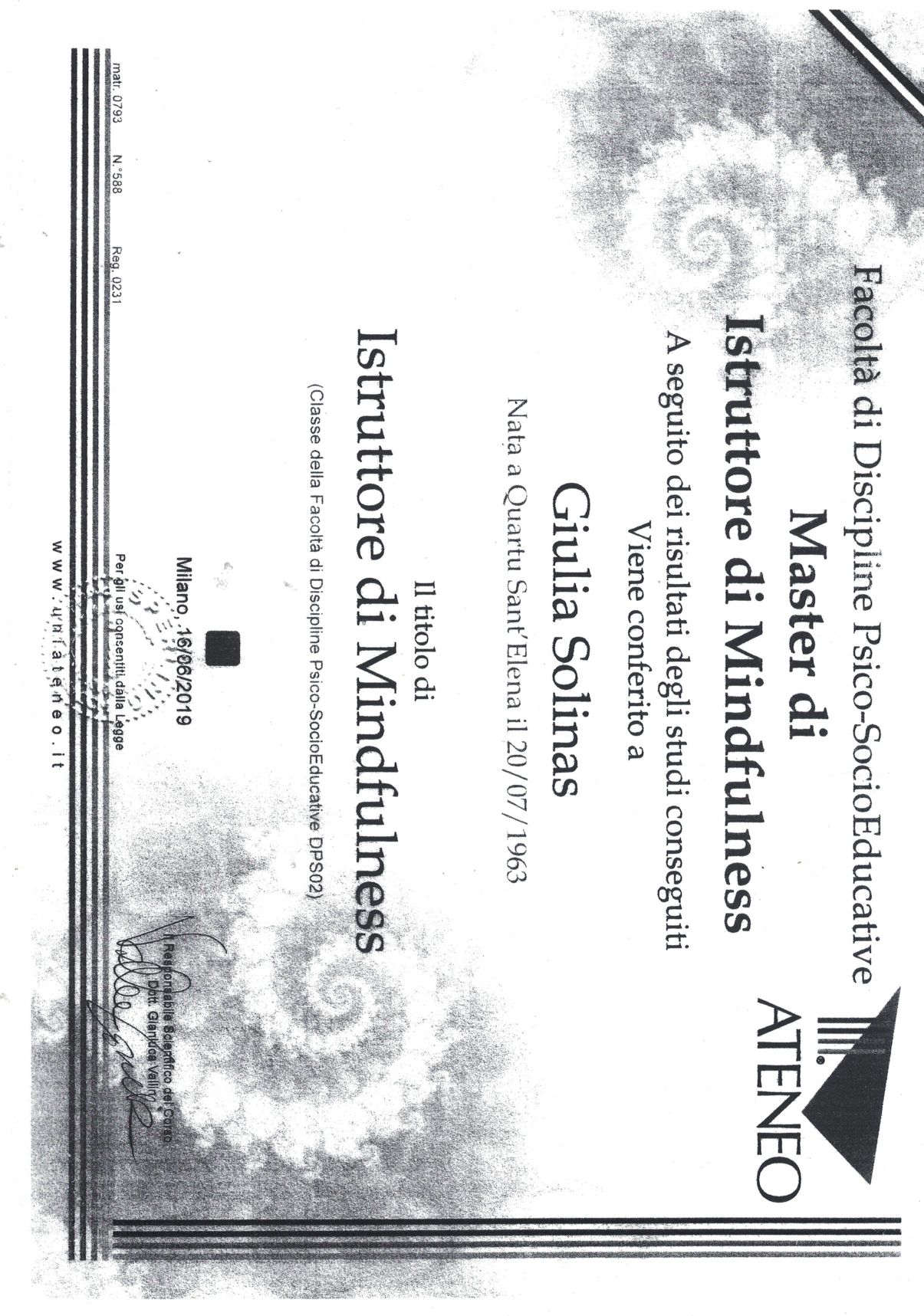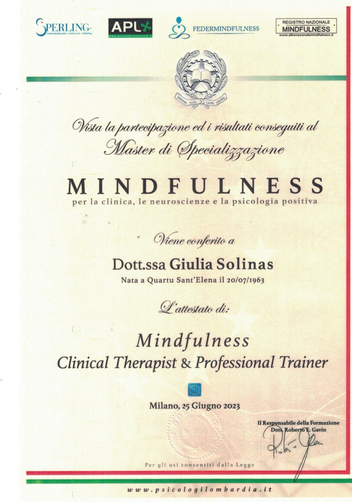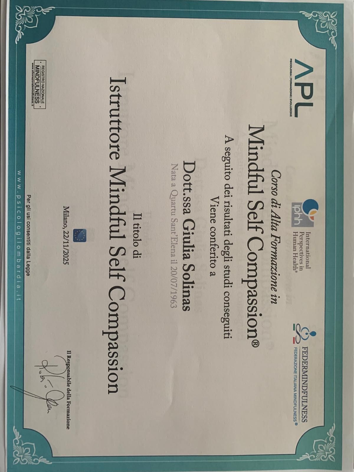 • Master di Specializzazione Mindfulness: titolo di Clinical Therapist e Professional Trainer conseguito in data 25/06/2023