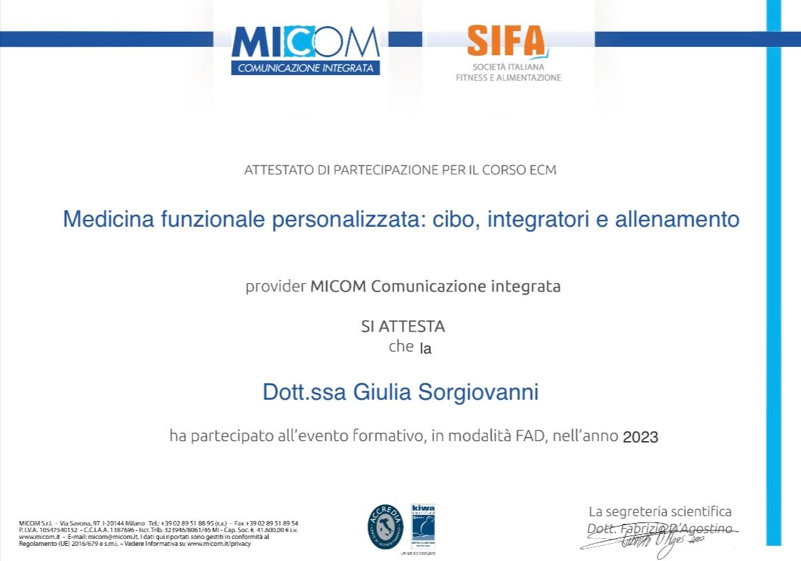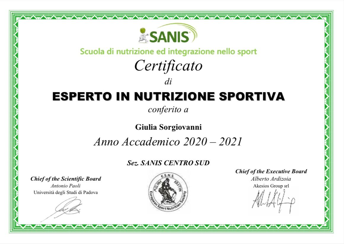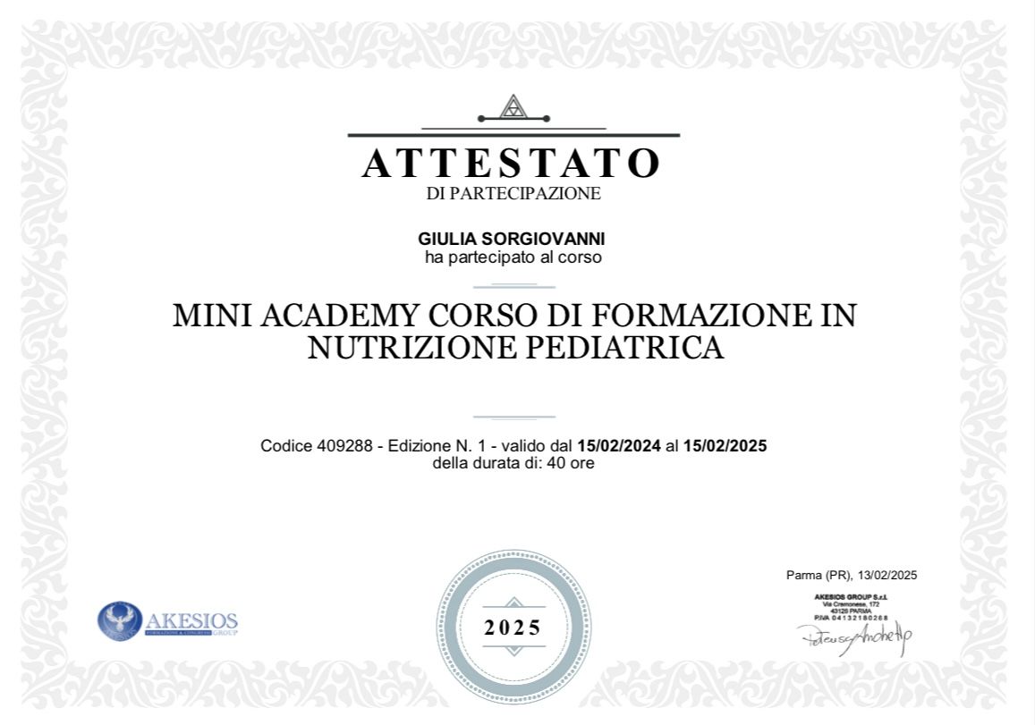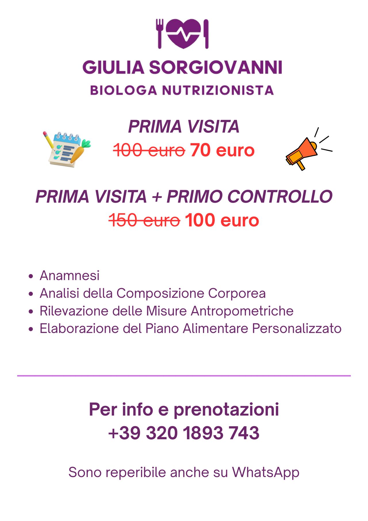 Salve a tutti! Sono la Dott.ssa Giulia Sorgiovanni Biologa Nutrizionista, iscritta all'ordine dei Biologi di Lazio e Abruzzo. Sono specializzata in nutrizione clinica, pediatrica, funzionale e sportiva. Mi occupo dell’elaborazione di piani alimentari personalizzati per il trattamento di condizioni patologiche, percorsi di dimagrimento o aumento del peso corporeo e promozione dell’educazione alimentare. Credo fortemente nell’importanza della comunicazione con il paziente: per questo motivo sono sempre disponibile per confronti e chiarimenti anche tramite WhatsApp o chiamata. Il mio approccio è orientato al benessere globale della persona, con particolare attenzione alle esigenze individuali in ogni fase della vita.