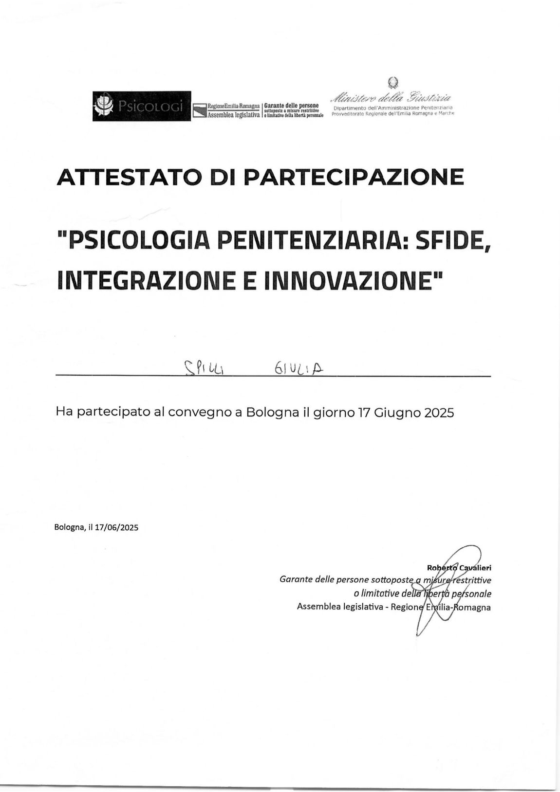 Ho una formazione specifica nell’ambito forense, giuridico e penitenziario. Da oltre un anno lavoro nella tutela delle vittime di reato, offrendo uno spazio di ascolto e sostegno psicologico. Da due anni sostengo autori e autrici di reato – e i loro familiari – in percorsi orientati alla responsabilizzazione, alla consapevolezza e al reinserimento sociale.