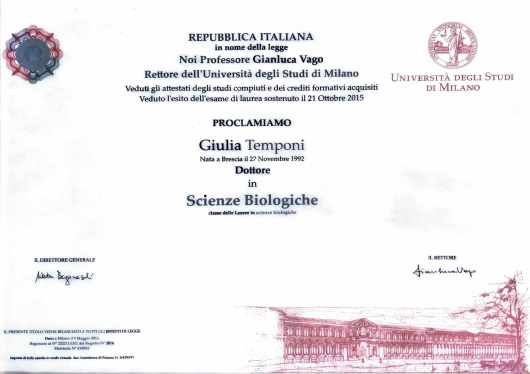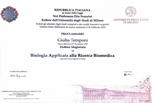 Nell’anno 2015 ho conseguito la laurea in Scienze Biologiche presso l’Università Degli Studi di Milano; successivamente ho proseguito gli studi conseguendo la laurea Magistrale in Biologia Applicata alla ricerca Biomedica nel febbraio 2018.
