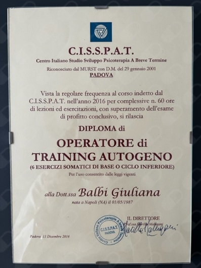 Sono inoltre operatrice di Training Autogeno, una tecnica di rilassamento e autoregolazione che aiuta a ridurre ansia e stress, migliorare la gestione delle emozioni e favorire una maggiore consapevolezza corporea, utile sia come supporto alla psicoterapia sia come intervento mirato.