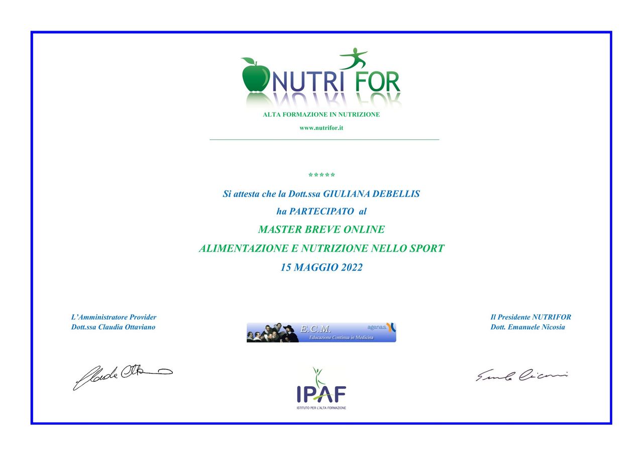 La Dott.ssa Giuliana De Bellis è molto più di una semplice nutrizionista sportiva: è una guida attenta, competente e sempre aggiornata. Sin dal primo incontro ho percepito la sua grande passione per il lavoro e la capacità di ascoltare davvero le esigenze della persona, personalizzando ogni piano alimentare in base agli obiettivi sportivi, al metabolismo e allo stile di vita.