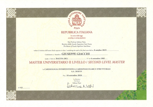 Nel 2019 ho ottenuto la certificazione di cardiologo interventista da parte della Società Italiana di Cardiologia Interventistica SICI-GISE.