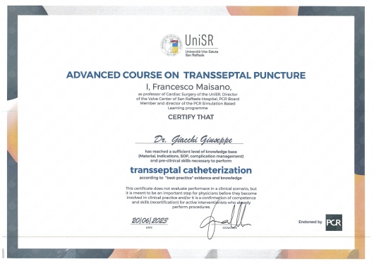 Nel 2023 ho ottenuto la certificazione dell'Università Vita-Salute San Raffaele di Milano e del PCR (importante società scientifica europea di cardiologia interventistica) per il cateterismo transettale, una delle più complesse manovre eseguite in cardiologia interventistica.