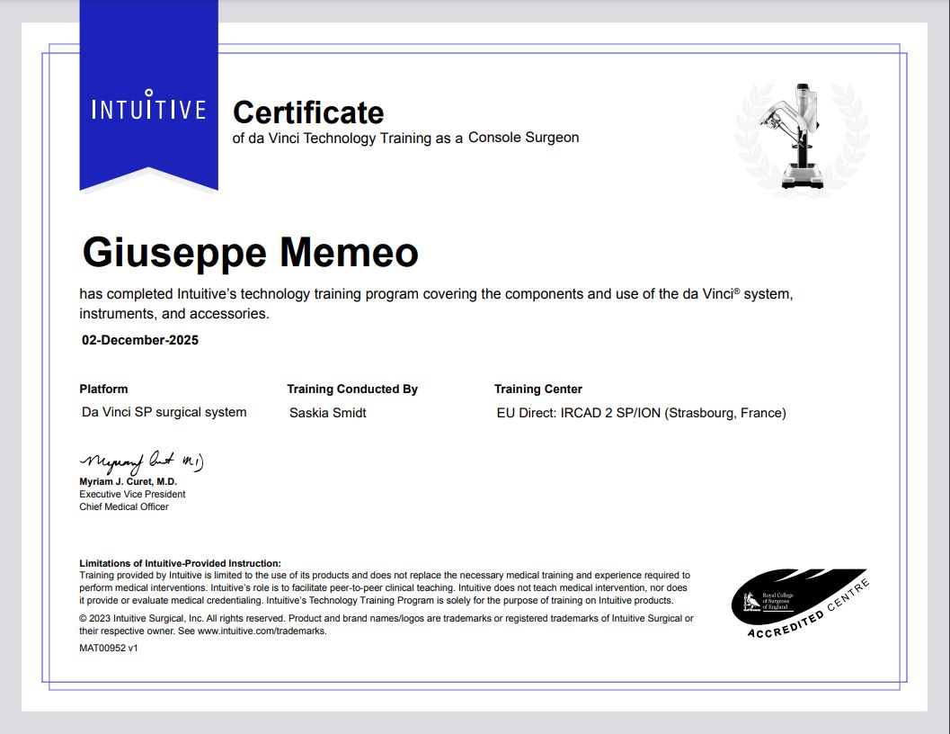 La visita con il dottor Memeo è stata ottima. Mi ha fornito spiegazioni chiare ed esaustive, rispondendo con pazienza a ogni mia domanda e trasmettendomi grande sicurezza e fiducia. Ho apprezzato molto la sua professionalità, il modo in cui ha illustrato in maniera dettagliata tutto ciò che era importante conoscere e la completezza con cui ha chiarito le diverse possibilità di accesso agli interventi.